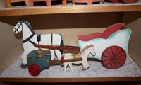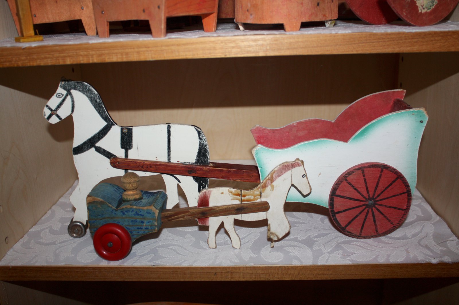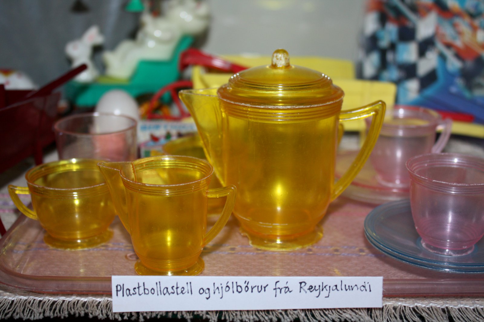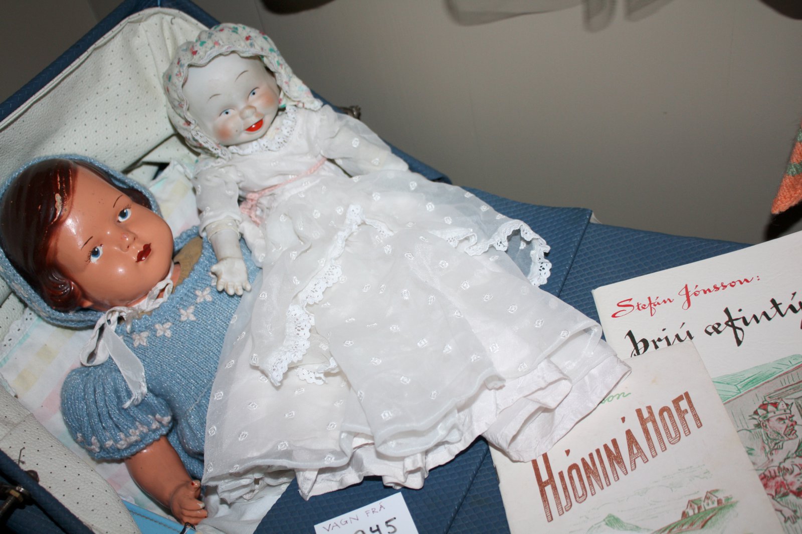 Úr varð að hún fór í fyrstu yfir leikföng í sinni eigu, það sem enn var til og varðveitt hafði verið frá hennar æskuheimili, eins og hinn dýrmæti rauði Reykjalundardúkkuvagn. Vinkonurnar lögðu líka í púkkið, „þannig að fyrstu leikföngin sem mér áskotnuðust voru það sem kallast hefðbundið stelpudót, mikið af brúðum, dúkkuvögnum og þetta helsta sem stelpur á árum áður léku sér að,“ segir Guðbjörg. Hún hafði úr nægu að moða þegar að þessum hlutum kom og tók þátt í sýningu með Minjasafninu á Akureyri árið 2003, en yfirskrift hennar var Dansi, dansi dúkkan mín.
