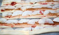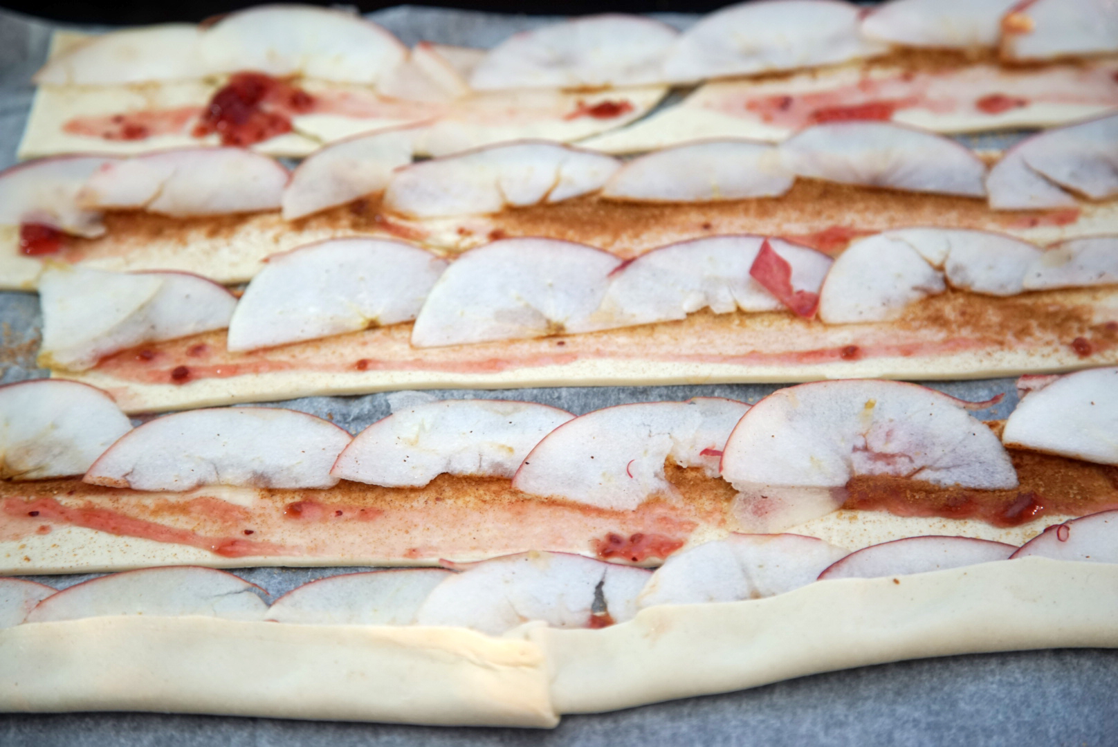 Dreifið sultu yfir deigið; setjið svo örlítið af kanilsykri yfir. Setjið eplasneiðar á efri hlutann af deiginu og látið skarast aðeins yfir brúnina af deiginu. Brjótið neðri hlutann af deiginu yfir eplasneiðarnar og myndið þannig langt „samlokudeig“ með eplasneiðum sem verða fyrir utan brúnina.