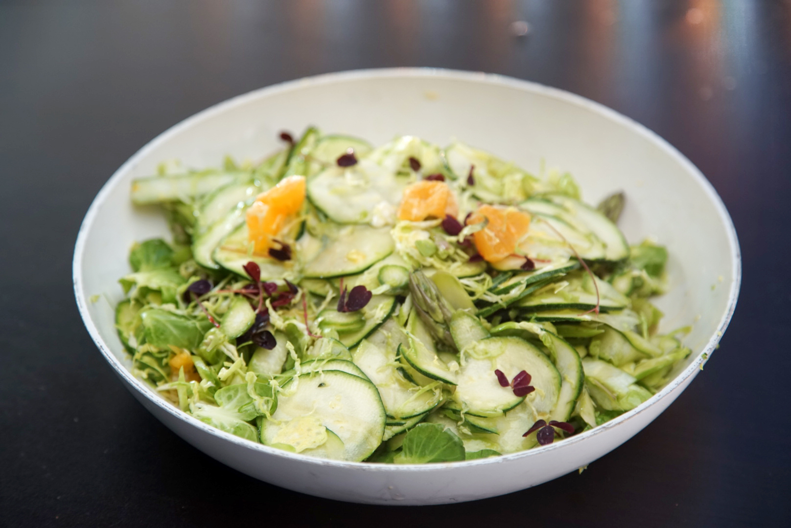 Fjarlægðu endana af sperglinum og rósakálinu og hentu þeim. Skerið rósakálið þunnt ásamt kúrbítnum.