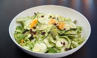 Takið dressinguna úr kæli og setjið helminginn yfir salatið. Kryddið til eftir smekk, geymið  í kæli og látið það standa í að minnsta kosti 20–30 mínútur áður en það er borið fram.