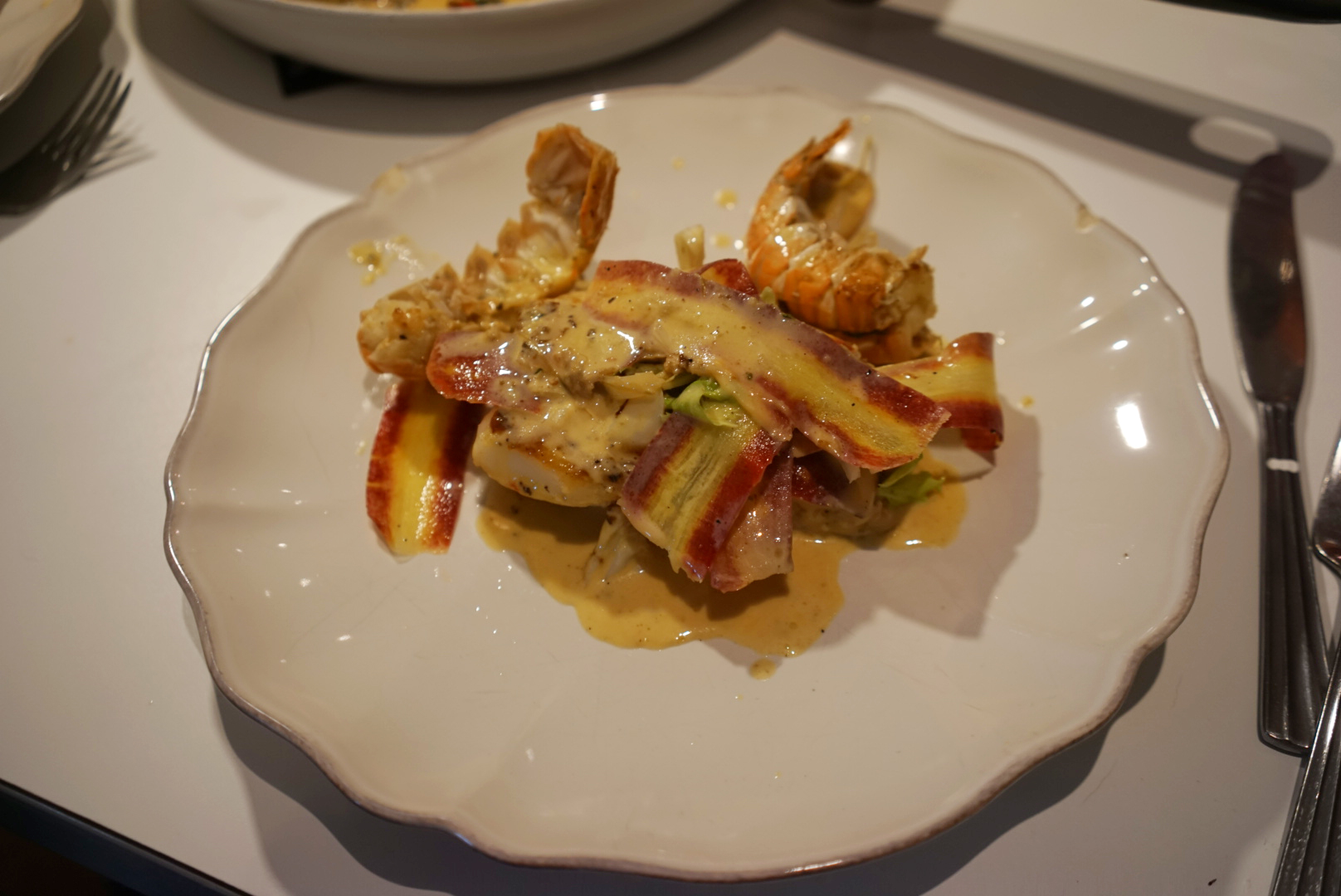 Steikið svo þorskinn ásamt humrinum með hvítlauk og smjöri, bætið svo fínt sneiddum gulrótum og rjóma við, ásamt þunnskornu selleríi og steikið í 2–3 mínútur á hvorri hlið. Framreiðið með kartöflum.