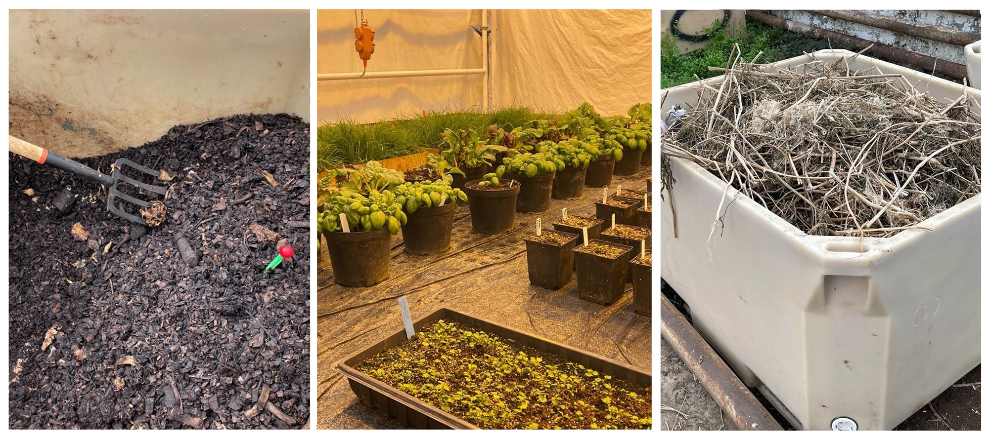 Mynd 1) Molta úr mötuneytinu á Reykjum ásamt stoðefni er notuð í ræktunartilraunir í gróðurhúsunum. Mynd 2) Athugun á mismunandi jarðvegsblöndum með lífrænum og tilbúnum áburði og uppeldi elriplantna. Mynd 3) Hálmur úr iðnaðarhampi sem ræktaður var á Reykjum sl. sumar, ætlaður til jarðgerðarverkefna.