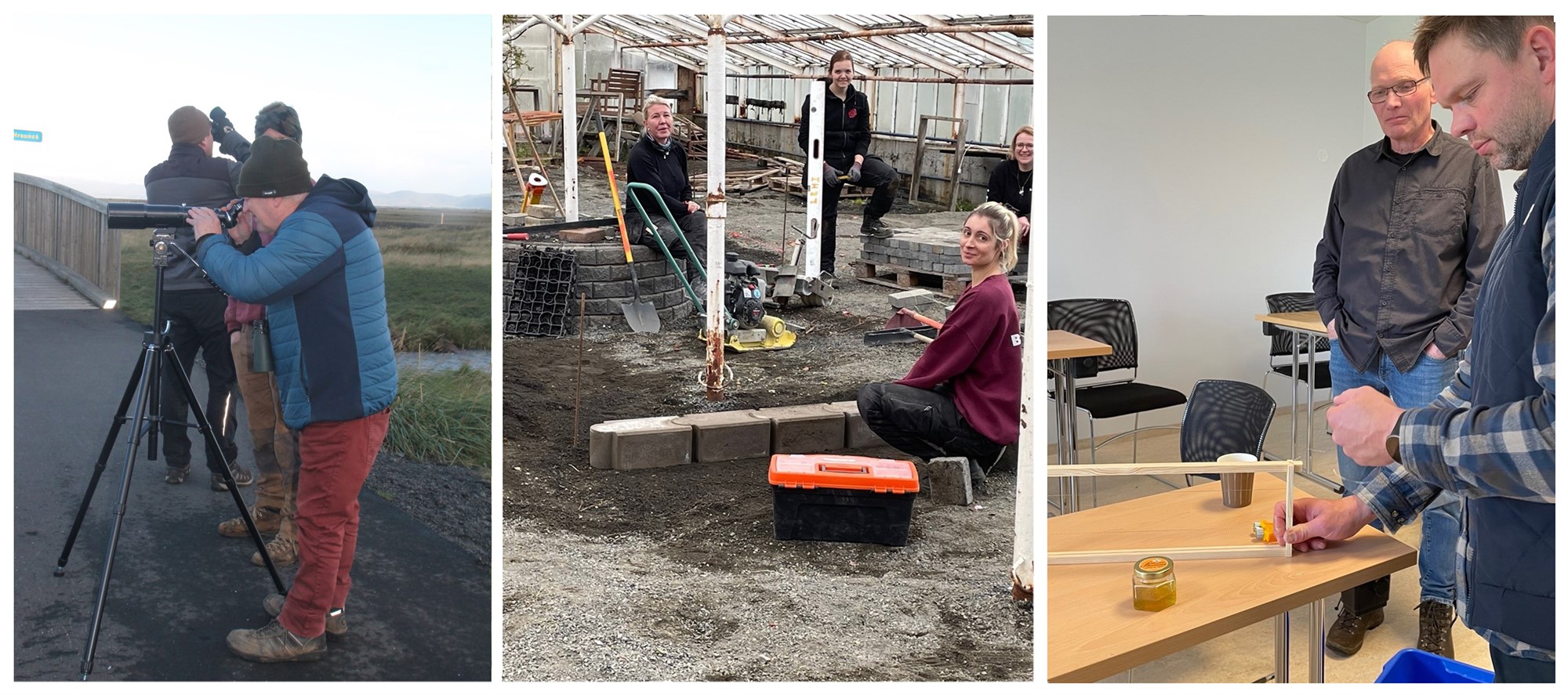 Mynd 1) Fuglaskoðunarferðir eru fastur liður í kennslu í dýrafræði. Mynd 2) Skrúðgarðyrkjunemar við æfingar í verknámshúsi. Mynd 3) Býflugnarækt er kennd á Reykjum. Hér er verið að setja saman ramma í býflugnabú.