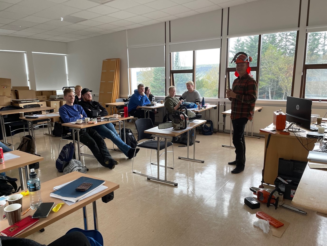 Skógtækninemar fræðast um öryggisatriði í meðferð véla til grisjunar og skógarhöggs.