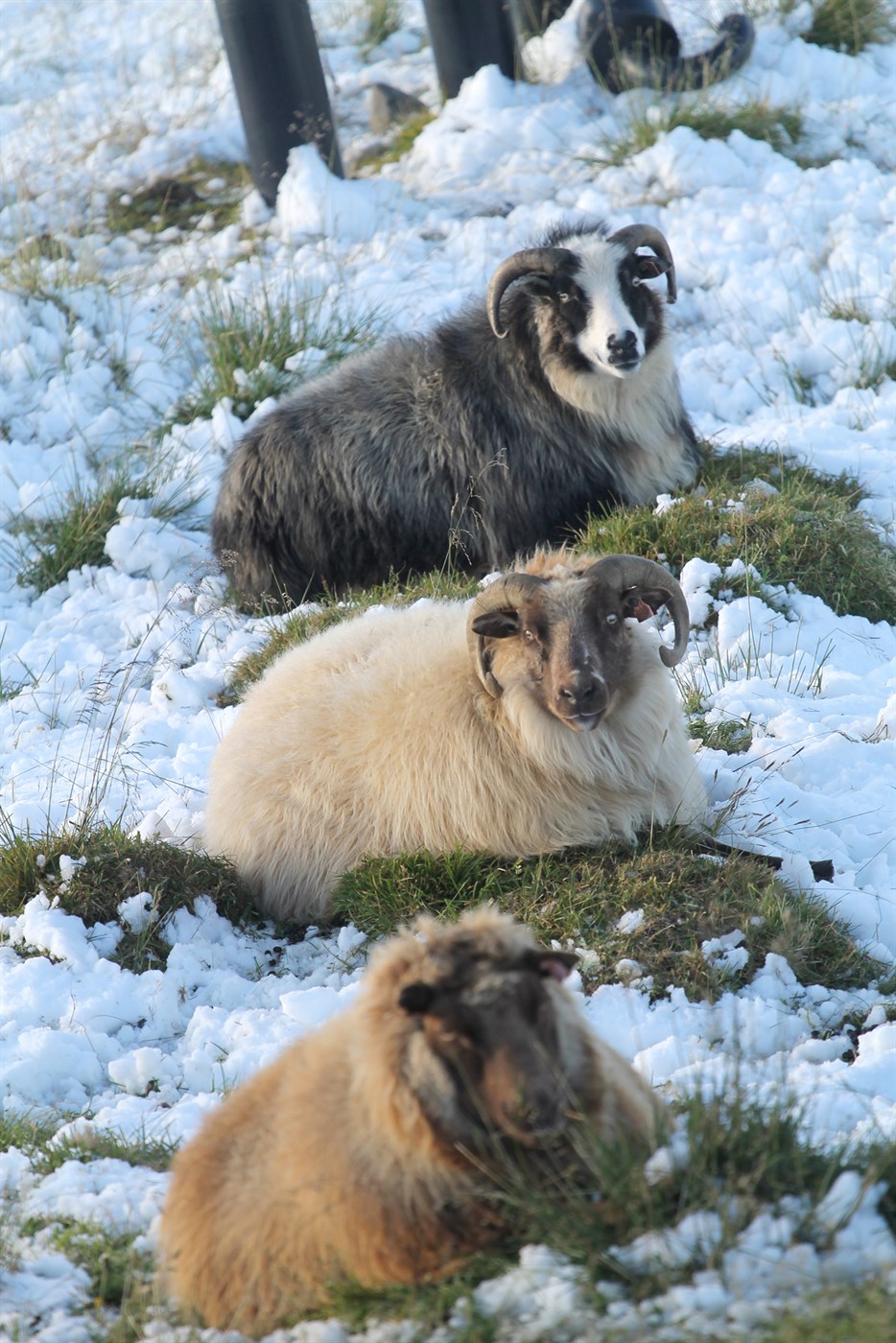 Þrír sauðir. Sá efsti er hélusvartbotnuarnhöfðóttur, sá í miðið mógolsubotnóttur og svo grámórauður.