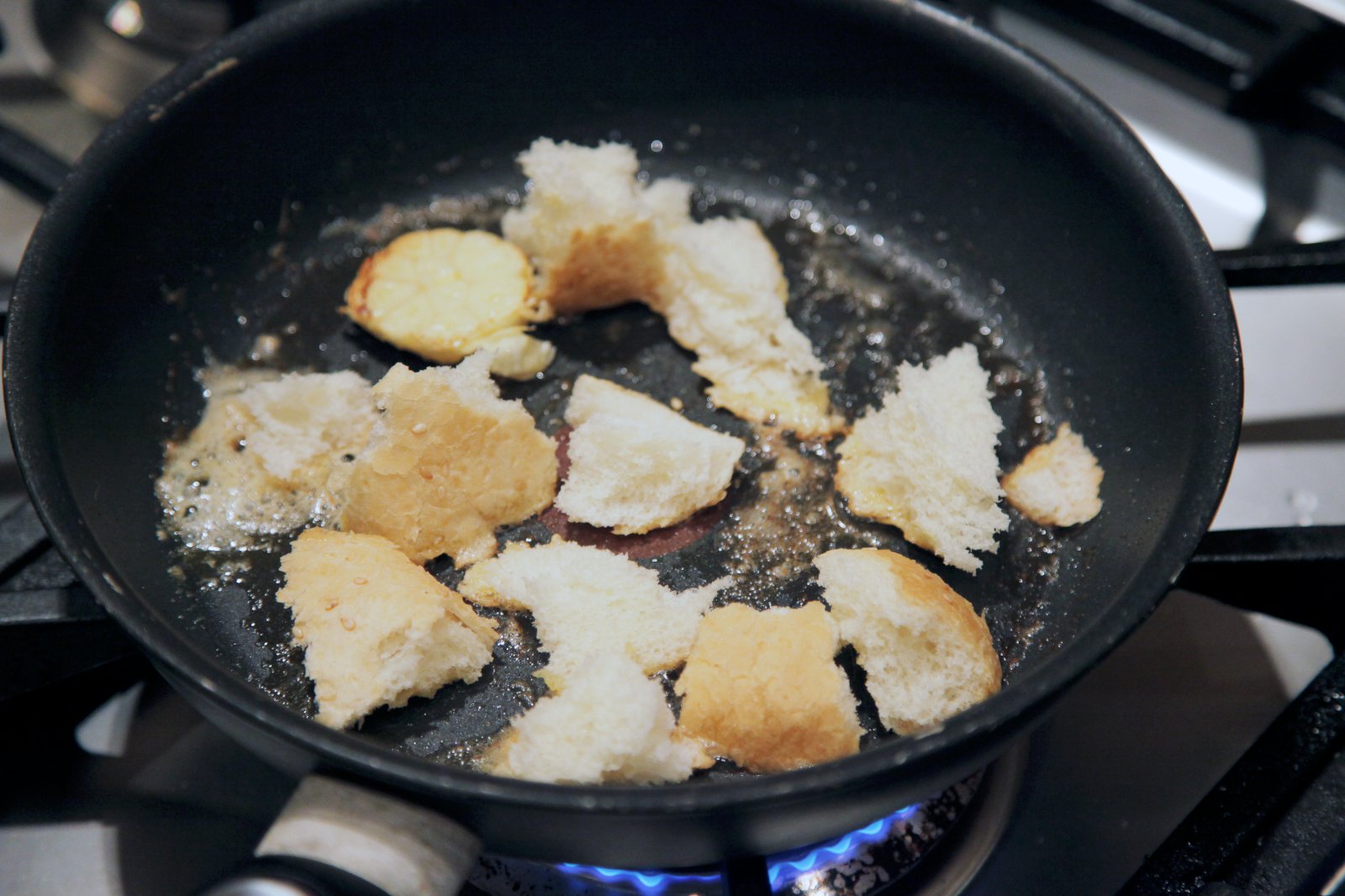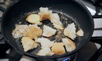 Skerið brauðið í ½ cm teninga. Hitið smjör á pönnu, fleytið froðuna ofan af og steikið brauðbitana gullinbrúna og stökka. Setjið á eldhúspappír og svo aftur á þurra pönnuna. Stráið parmesanosti yfir og hristið pönnuna vel.