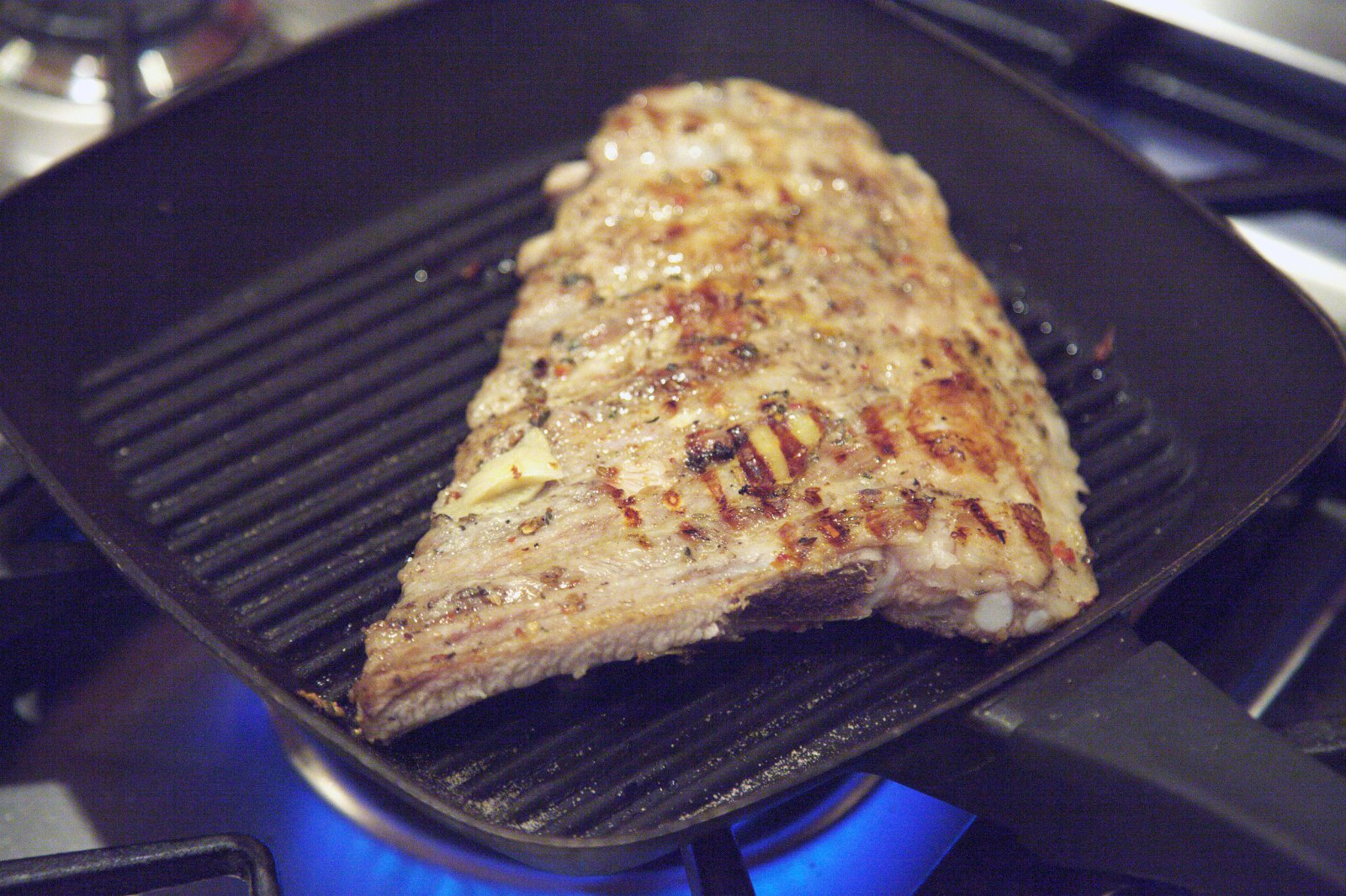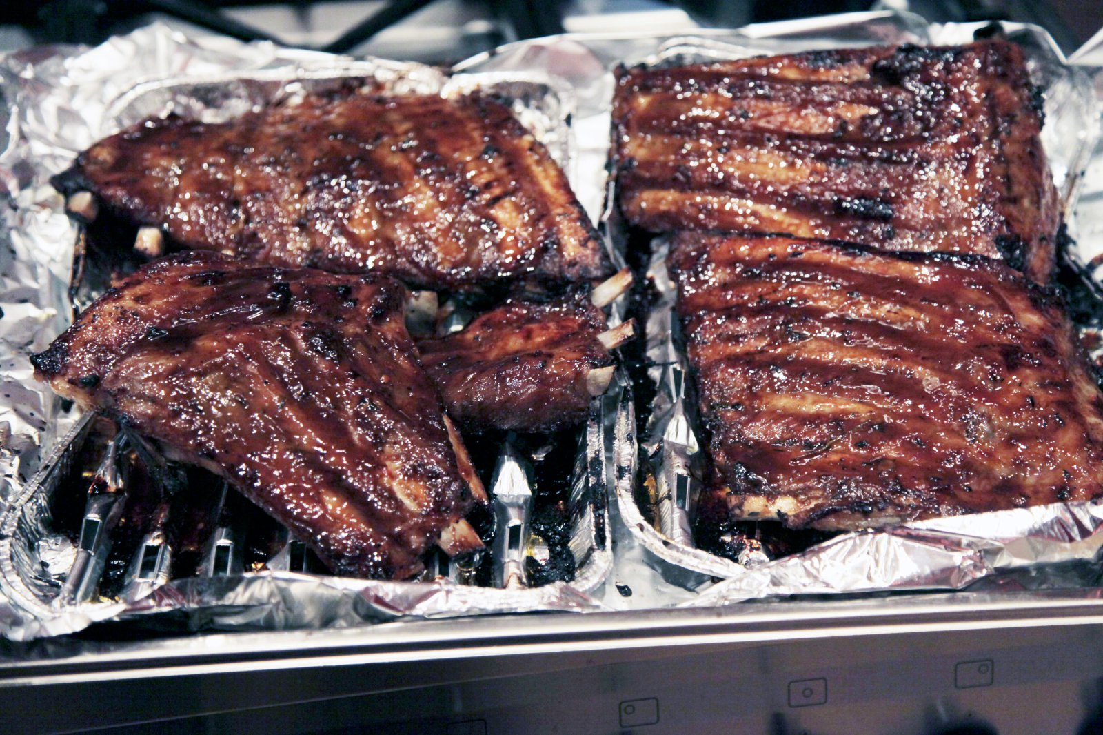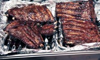 Brúnið rif á grillpönnu eða grillið á útigrilli. Penslið sósu á rifin og bakið áfram í ofni. Penslið tvisvar sinnum á 10 mínútna fresti og brúnið svo undir grilli til að karamella sósuna. Berið fram með hrásalati.