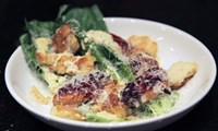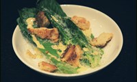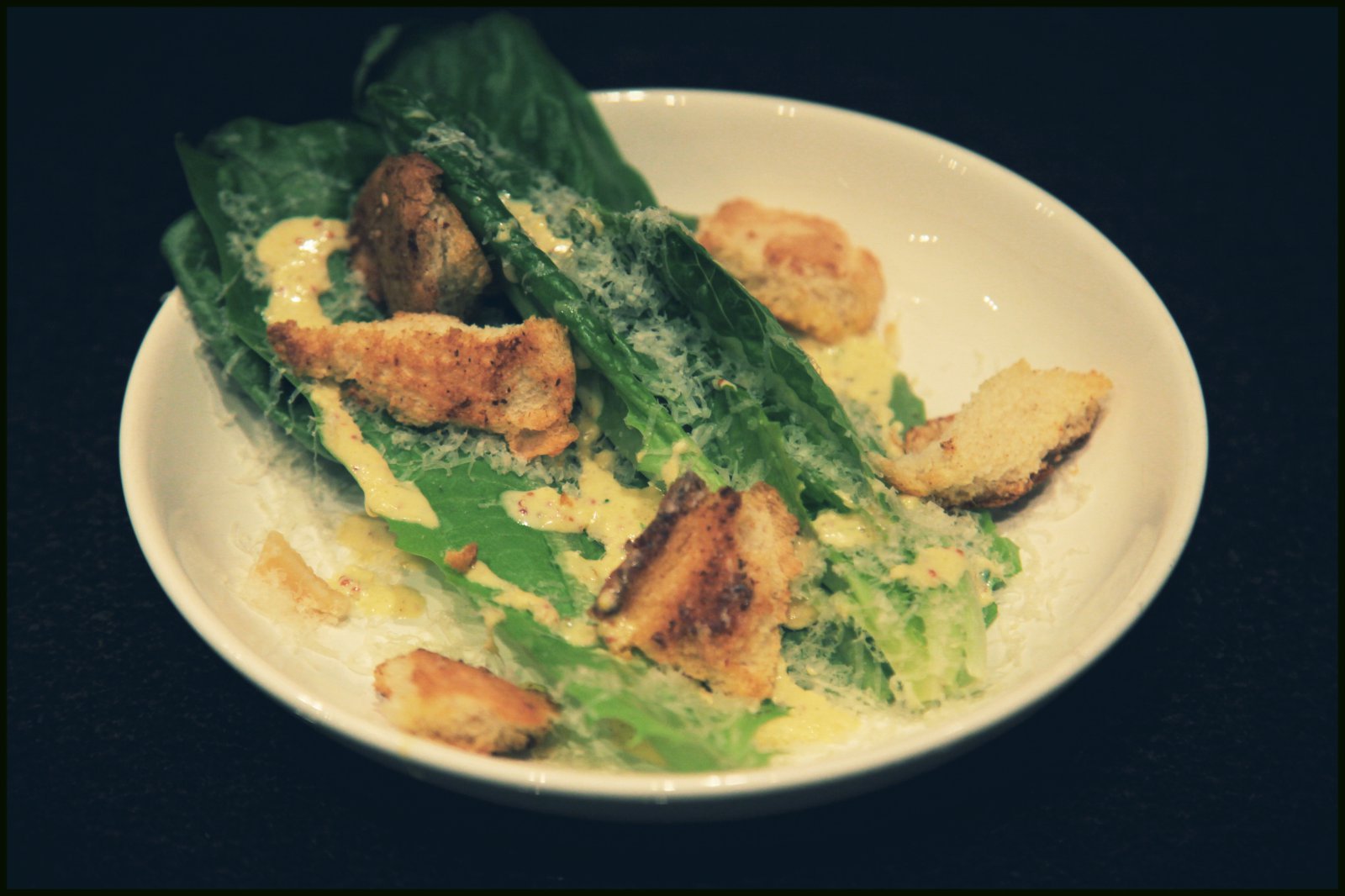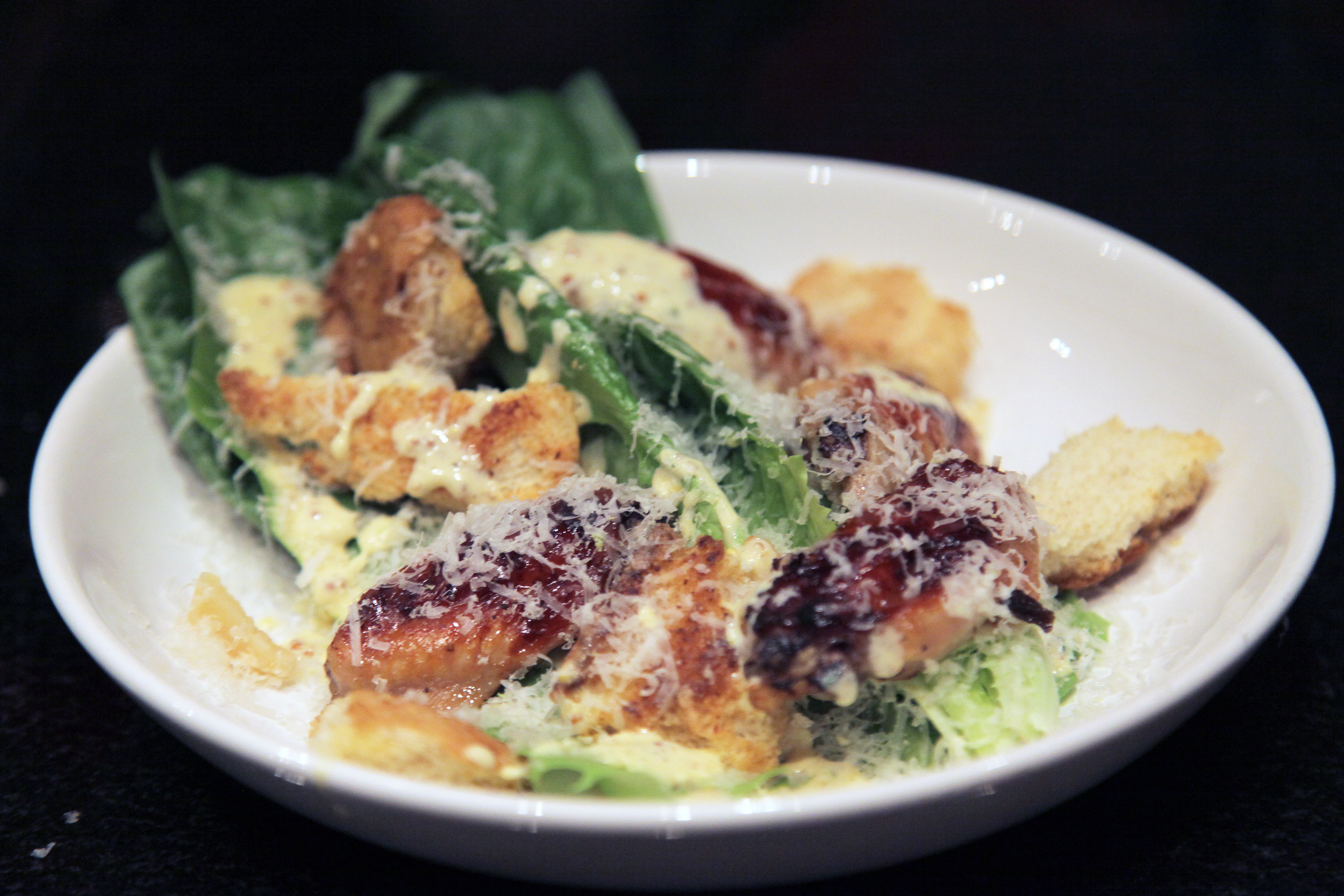 Setjið smá dressingu á diska og rífið parmesanost yfir. Setjið 3-4 salatblöð á diskana, smá dressingu aftur yfir, ásamt parmesanosti. Endurtakið þetta tvisvar sinnum. Stráið brauðteningum yfir og skreytið með graslauk. Ekki skemmir að rífa kjúklingaafganga í salatið.