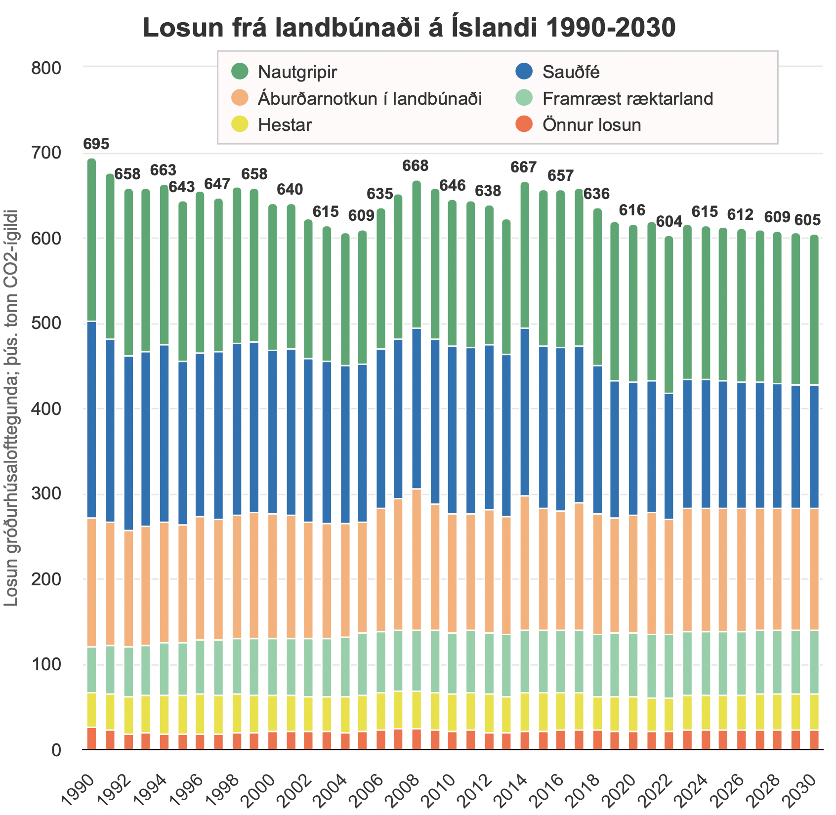 Spurð um forsendur útreikninganna á losun frá undirflokkunum, segir Diljá að bæði sé notast við losunarstuðla frá IPCC og losunarstuðla sem byggja á innlendum rannsóknum og gögnum. „Stuðlar frá IPCC eru notaðir við útreikninga á losun frá áburðarnotkun í landbúnaði, hestum og öðrum uppsprettum. Innlendir stuðlar eru notaðir við útreikninga á losun frá nautgripum, sauðfé og framræstu ræktarlandi.
