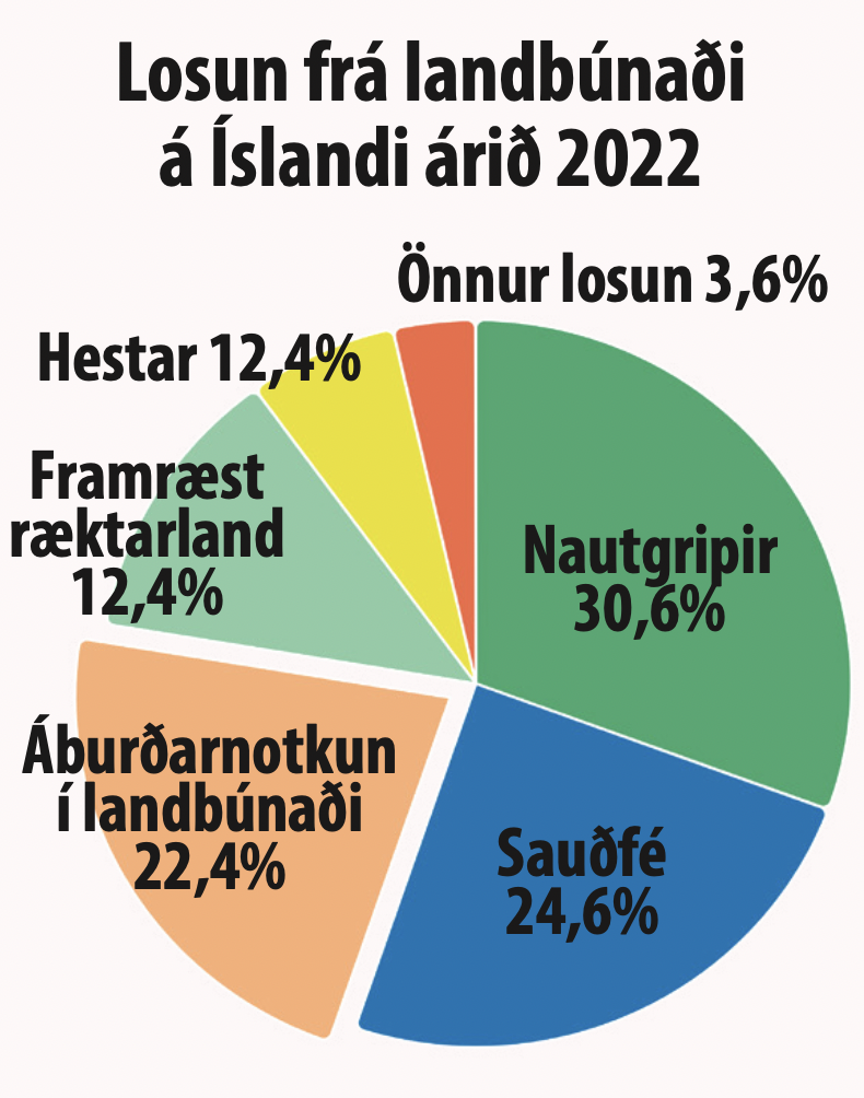 Losun frá landbúnaði taldist vera um 22 prósent af þeirri losun sem fellur undir beina ábyrgð Íslands árið 2022. Til samanburðar var losun vegna vegasamgangna um 33 prósent af losun á beinni ábyrgð Íslands það ár. Heildarlosun frá landbúnaði er skipt niður í sex undirflokka; mest losa nautgripir, eða 30,6 prósent, sauðfé síðan með 24,6 prósent og áburðarnotkun með 22,4 prósent. Framræst ræktarland er með 12,4 prósent af heildarlosun, hestar með 6,4 prósent og önnur losun flokkast með 3,6 prósent.