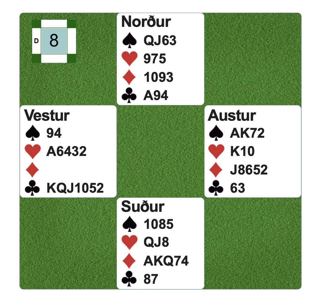 Vestur gefur enginn á hættu. Á öðru borðinu voru spiluð 2grönd í suður og samningurinn lak einn niður.