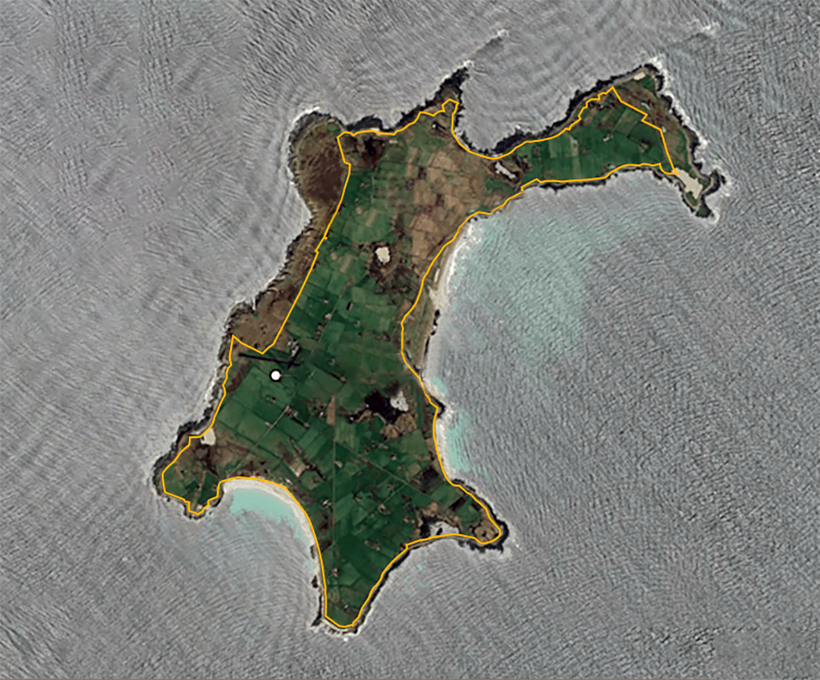 Hér má sjá útlínur garðhleðslunnar sem halda fénu frá ræktarlandi eyjunnar þannig að féð hefur einungis beitarland í og við fjöruna.