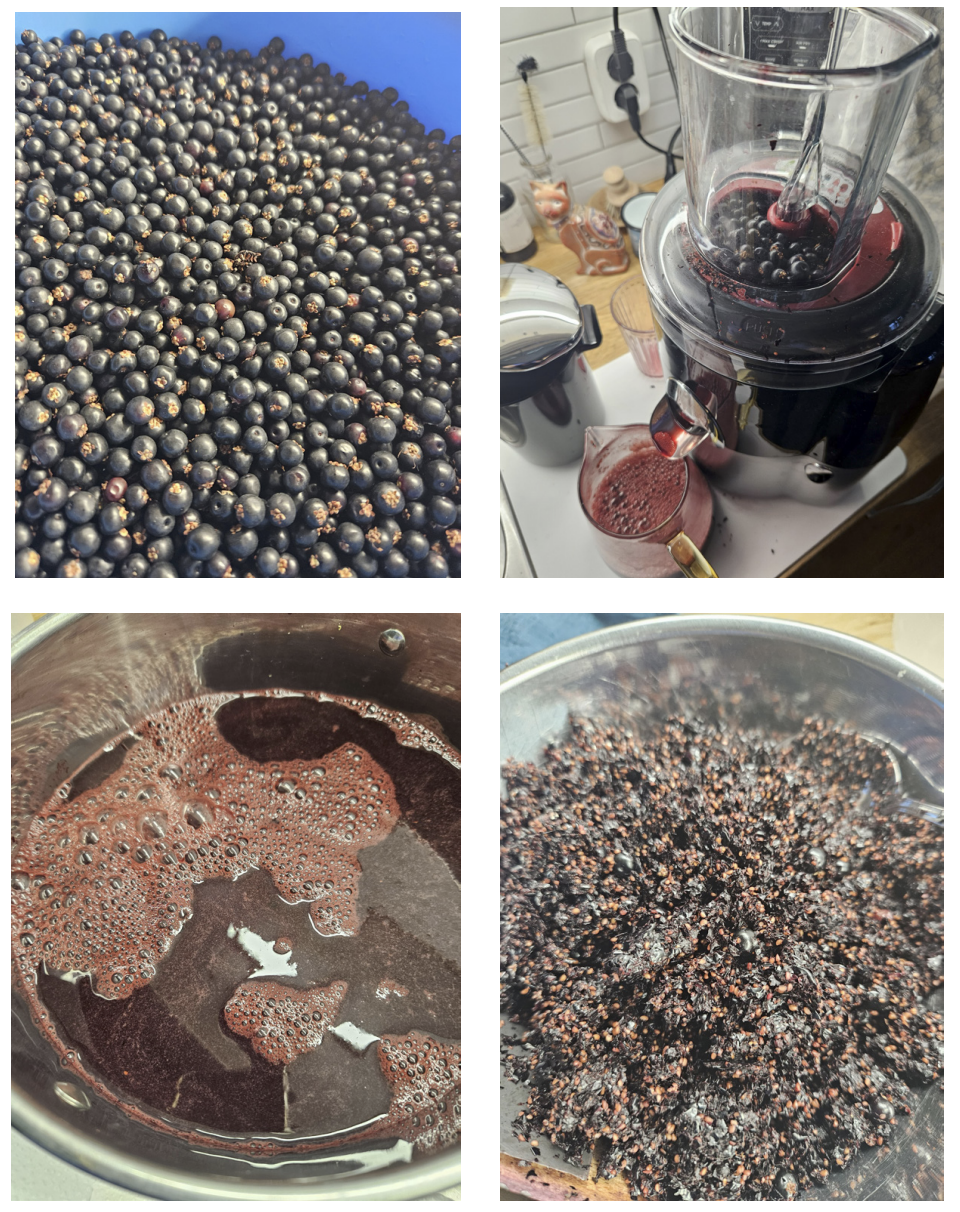 Frá krækiberjum til hrásaftar. Hratið er síðan þurrkað til að nota síðar í te. Einnig má dreifa því út í garð, til áburðar.