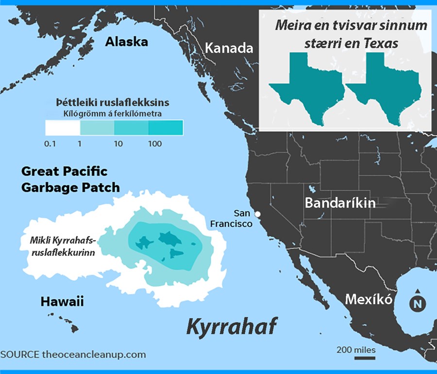 Miðja vegu milli Kaliforníu og Havaí í Kyrrahafi er svæði sem þekkt er sem „Mikli Kyrrahafs-ruslaflekkurinn“, eða Great Pacific Garbage Patch.