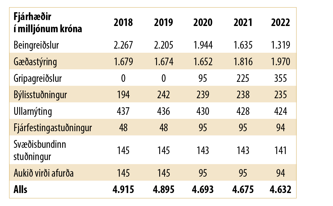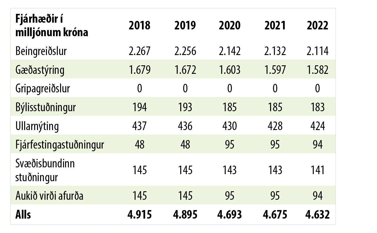 Tillagan gerir ráð fyrir frystingu á gæðastýringargreiðslum, býlisgreiðslum og gripagreiðslum í fjögur ár en á móti yrði bætt við beingreiðslum svo heildar stuðningsupphæðin yrði sú sama til ársins 2022.