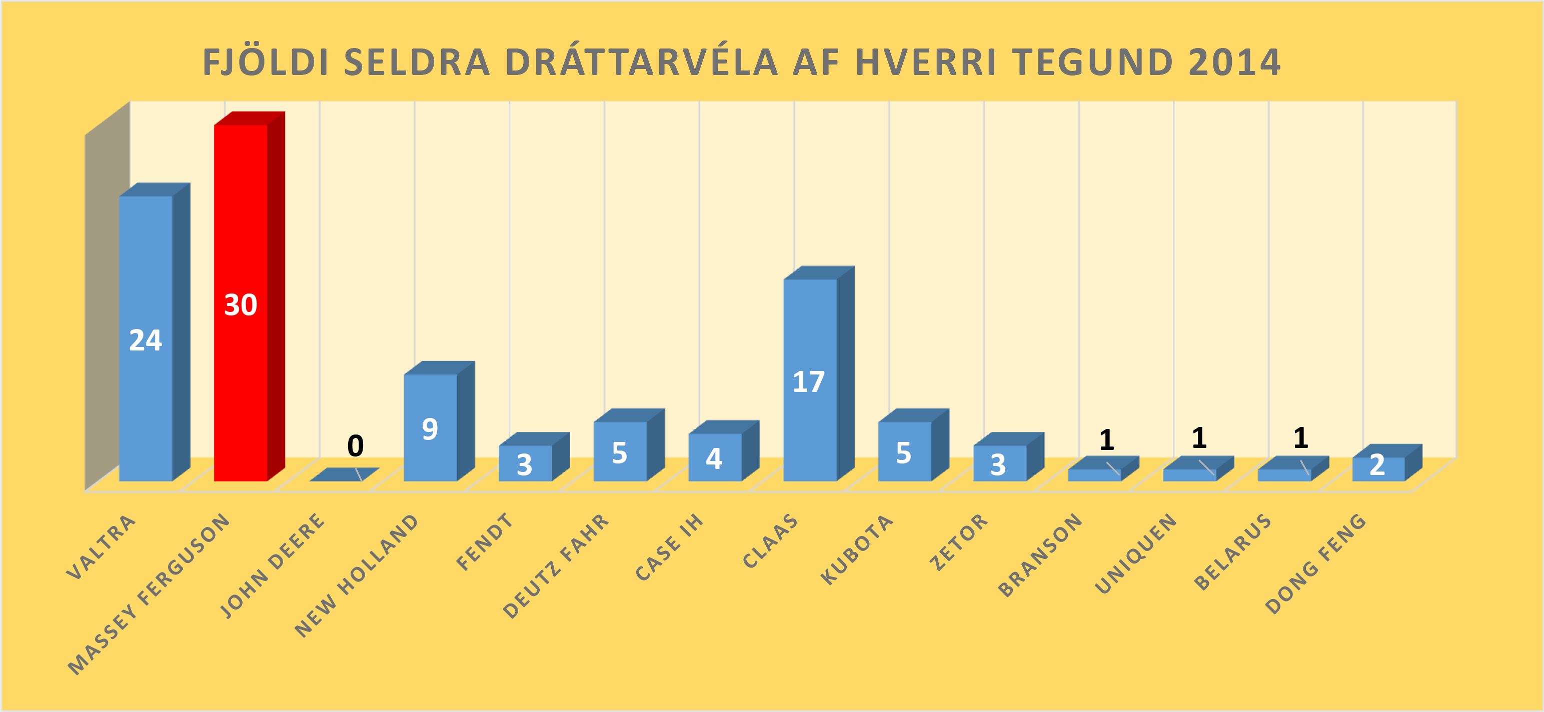 Á síðasta ári voru fluttar inn 30 nýjar Massey Ferguson vélar. Er hann greinilega langvinsælasta tegundin, með 28,6% hlutdeild af heildarsölu dráttarvéla hér á landi á síðasta ári. Á árinu 2013 voru seldar 28 Massey Ferguson vélar sem veltu þá úr sessi Valtra sem var söluhæst árið 2012 en er nú í öðru sæti eins og í fyrra. Í þriðja sæti er svo Claas sem kemst þar upp fyrir New Holland sem var í þriðja sætinu á síðasta ári.