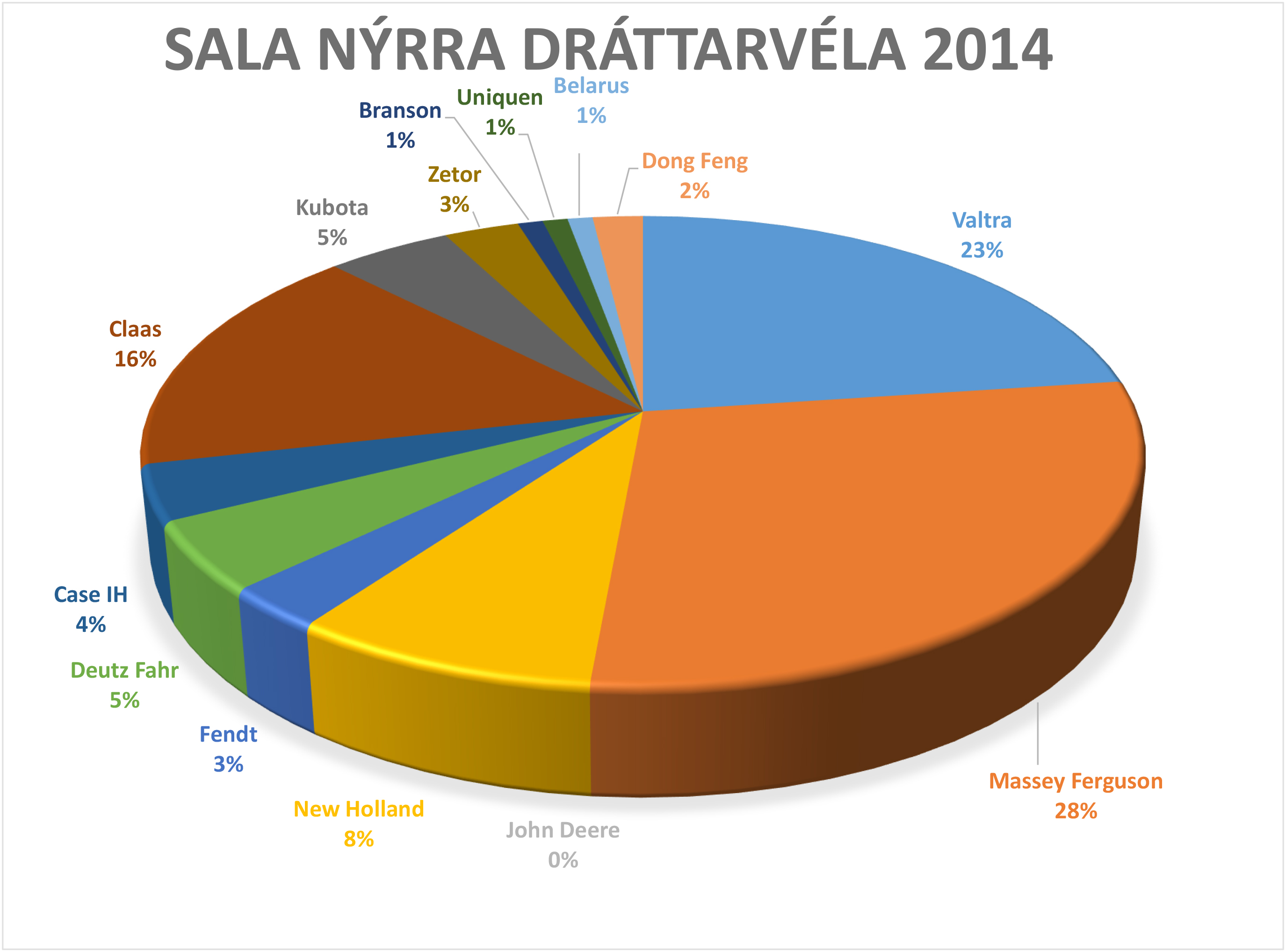 VB Landbúnaður seldi 3 Zetor dráttarvélar en enga John Deere vél. Markaðshlutdeild fyrirtækisins er því 2,8% en var 12% hlutdeild árið 2013. Vegur hver einasta vél þungt í slíkum útreikningi og ekki þarf mikið til að breyta stöðunni á markaðnum.