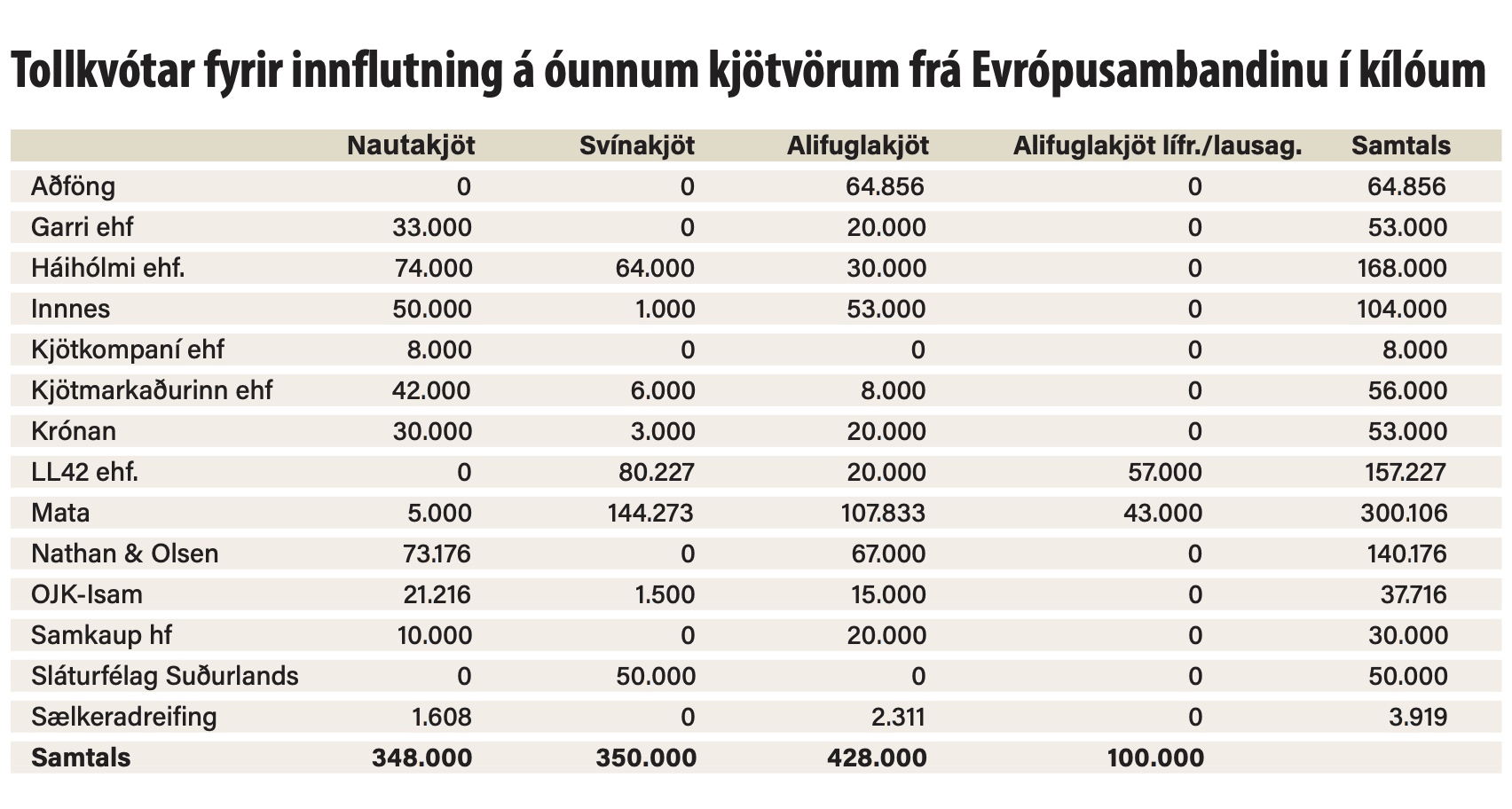 Búið er að úthluta tollkvótum fyrir landbúnaðarvörur frá Evrópusambandinu fyrir tímabilið 1. janúar 2026 til 30. júní 2026 og fær Mata langmest af kvótanum fyrir óunnar kjötvörur, eða rúm 300 tonn. Næstmest fær Háihólmi, rúm 168 tonn, og síðan LL42 sem fær rúm 157 tonn.