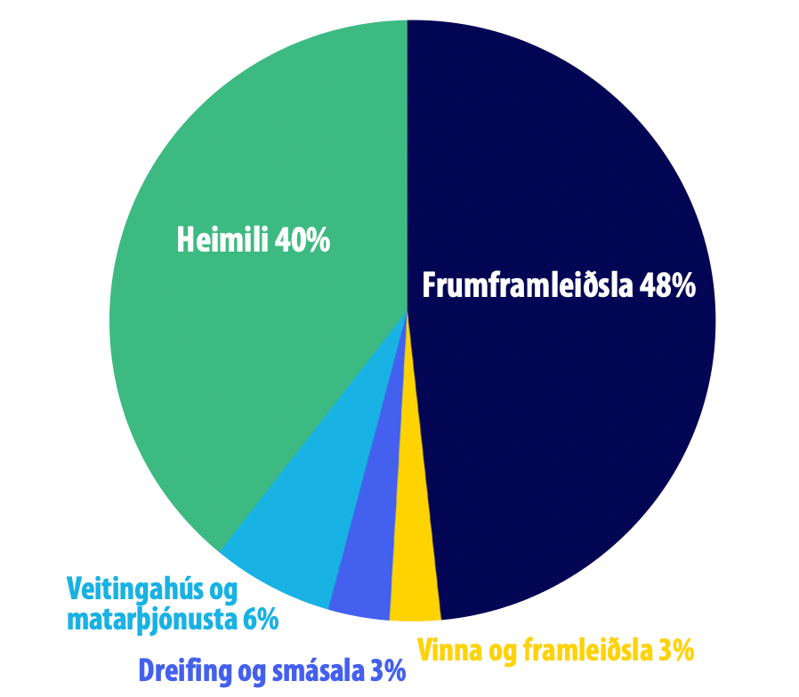 Sóunin er mest í frumframleiðslu, eða því sem nemur 29.000 tonnum, en minnsta sóunin á sér stað við vinnslu og framleiðslu, um 1.600 tonn. Heimili landsins sóa næstmest, eða tæplega 24.000 tonnum. Ekki er þó talið að matarsóun heimilanna hafi aukist milli ára heldur standi nokkuð í stað.