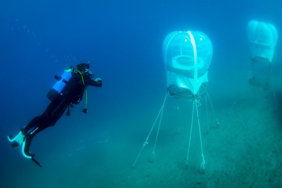 Blöðrunnar eða gróðurhúsin eru fest við sjávarbotninn þannig að þau haldast á um átta metra dýpi eftir að dælt hefur verið í þau lofti. Verkefnið sem kallast Nemógarðarnir er unnið í samvinnu kafara og garðyrkjufræðinga.