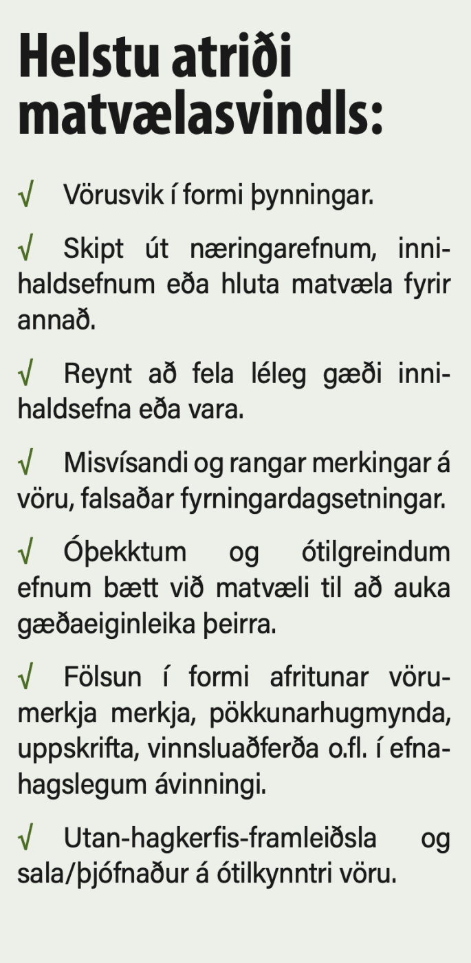 „Ísland er meðlimur í Evrópska hraðviðvörunarkerfinu um hættuleg matvæli og fóður (RASFF) og þar er m.a. flokkur um matvælasvindl (e. Food Fraud). Árið 2023 komu alls 758 tilkynningar um matvælasvindl í gegnum kerfið en í heildina voru RASFF-tilkynningar 4.695 talsins,“ útskýrir Herdís.