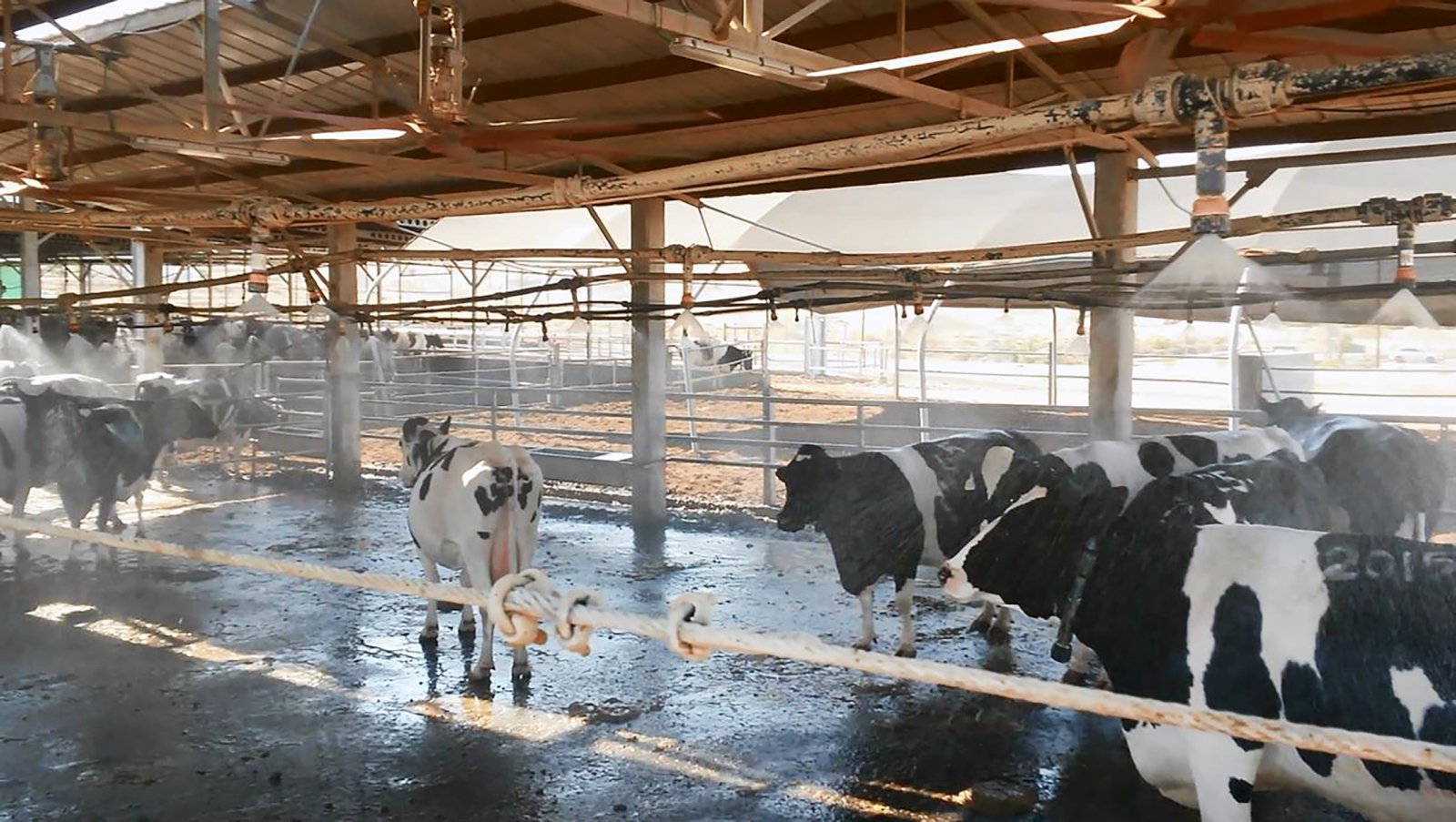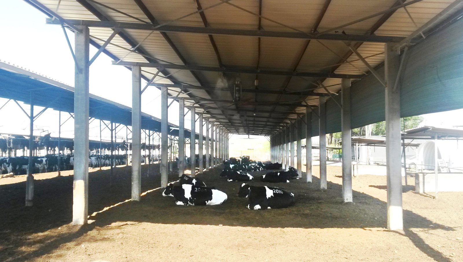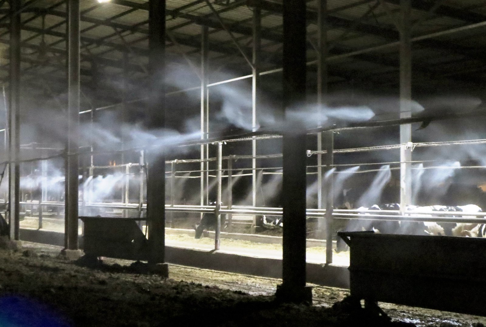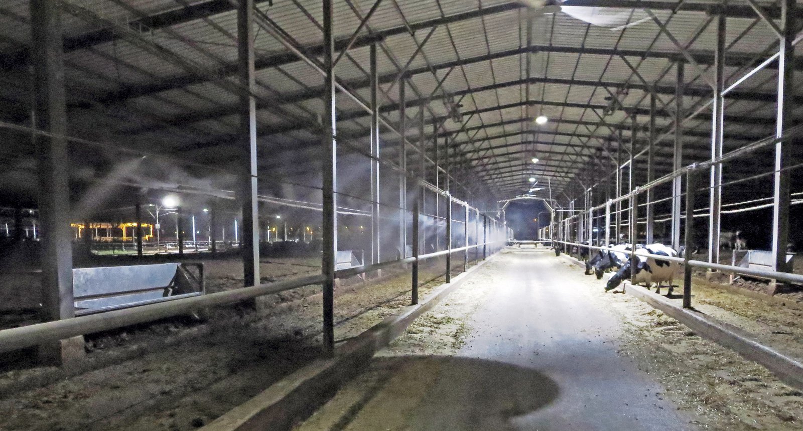 Í þessu búi eru kýrnar hafðar í fjórum verulega mikið opnum fjósum og eru stórar viftur víða í fjósunum til þess að halda loftinu á hreyfingu. Örfínn úði dælist út meðfram viftuspöðunum til þess að kæla loftið lítillega en aðalkælingin á kúnum fer þó fram á vökvunarsvæðinu en til þess að kæling með vökvun hafi áhrif þarf húðin að rennblotna svo úði hefur lítil sem engin áhrif til raunverulegrar kælingar.