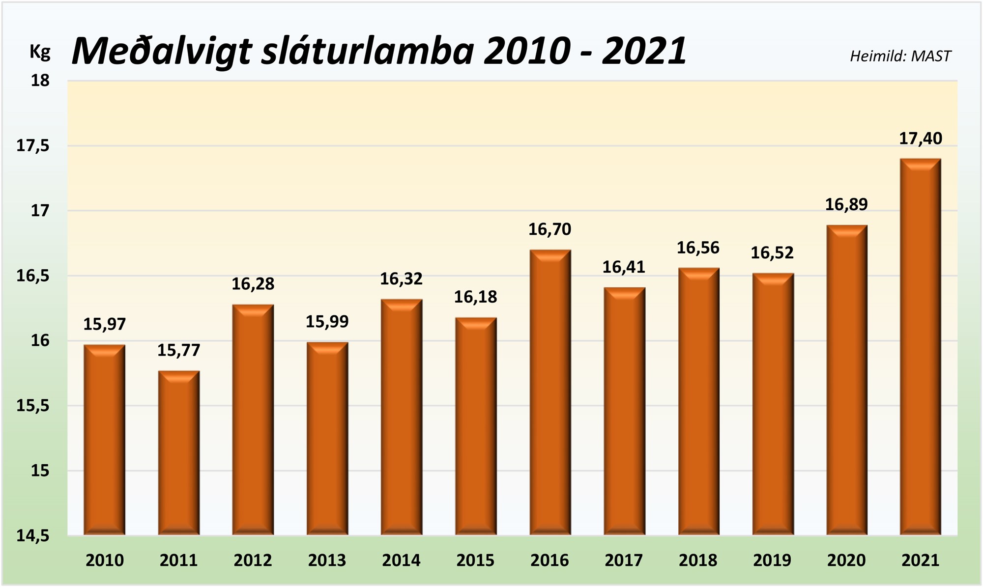 Hækkandi meðalvigt sláturlamba er vart skýrð með öðru en góðum árangri í ræktunarstarfi bænda. Þó hefur gott tíðarfar í sumar eflaust hjálpað til við að hífa meðalfallþungann upp um hálft kíló á milli ára.