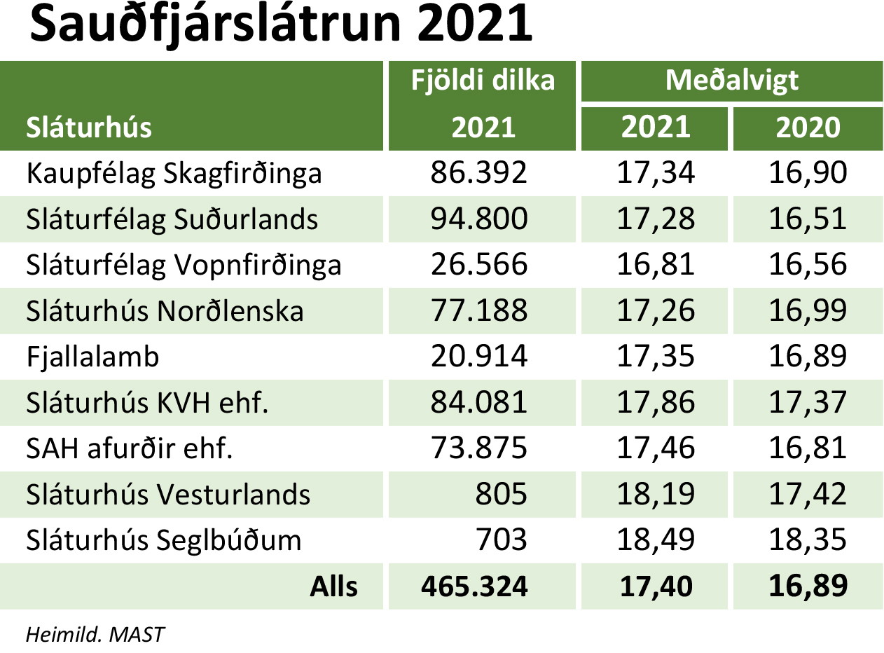 Minnsta meðalvigtin var hjá Sláturfélagi Vopnfirðinga, eða 16,81 kg, sem var 470 grömmum lægri meðalvigt en hjá Sláturfélagi Suðurlands sem var með næst lægstu meðalvigt á þessu hausti.