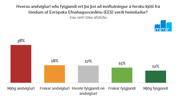 MMR birti í dag niðurstöður úr könnun á skoðun Íslendinga á innflutningi á fersku kjöti frá löndum á Evrópska efnahagssvæðinu. Þar kemur fram að 55 prósent fólksins sem tók afstöðu er andvígt slíkum innflutningi, en 27 prósent er honum fylgjandi.