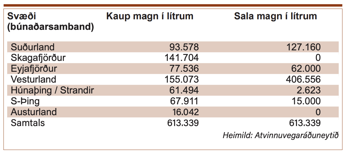 Mest fór af kvótanum á Vesturland að þessu sinni, eða rúmir 155 þúsund lítrar af þeim rúmu 613 þúsund lítrum sem heildarviðskiptin náðu yfir. Næstmest fer í Skagafjörðinn, eða tæpir 142 þúsund lítrar. Salan er einnig mest frá Vesturlandi, eða 406.556 lítrar.