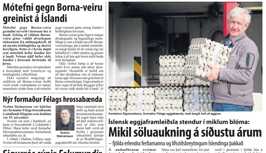 Fyrir fimm árum, í jólablaði Bændablaðsins árið 2013, var sagt frá gríðarlegri söluaukningu á íslenskum eggjum. Rætt var við Þorsteinn Sigmundsson eggja- og kjúklingabónda í Elliðahvammi og formann eggjabænda sem sagði að desembermánuður hefði slegið öll met – þrátt fyrir að hann væri varla hálfnaður. Hann sagði að lífsstílsbreytingar og fjölgun ferðamanna á Íslandi skýri söluaukninguna.