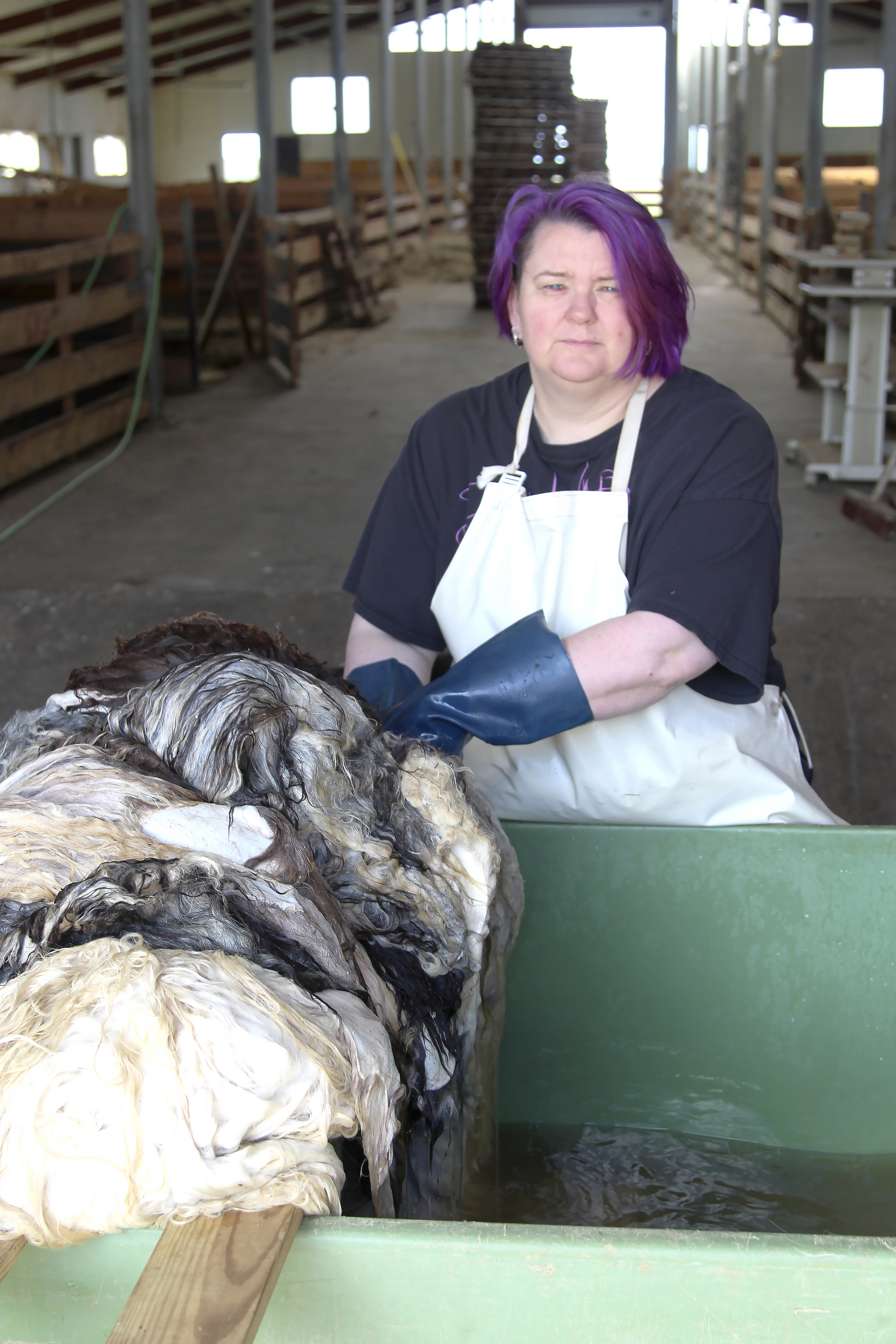 Þóra Sif Kópsdóttir, bóndi á Ystu-Görðum í Borgarbyggð, hefur nóg að gera við að súta skinn, eftirspurn hefur aukist hin síðari ár. Það er í tísku að eiga gæru. Mynd / Úr einkasafni