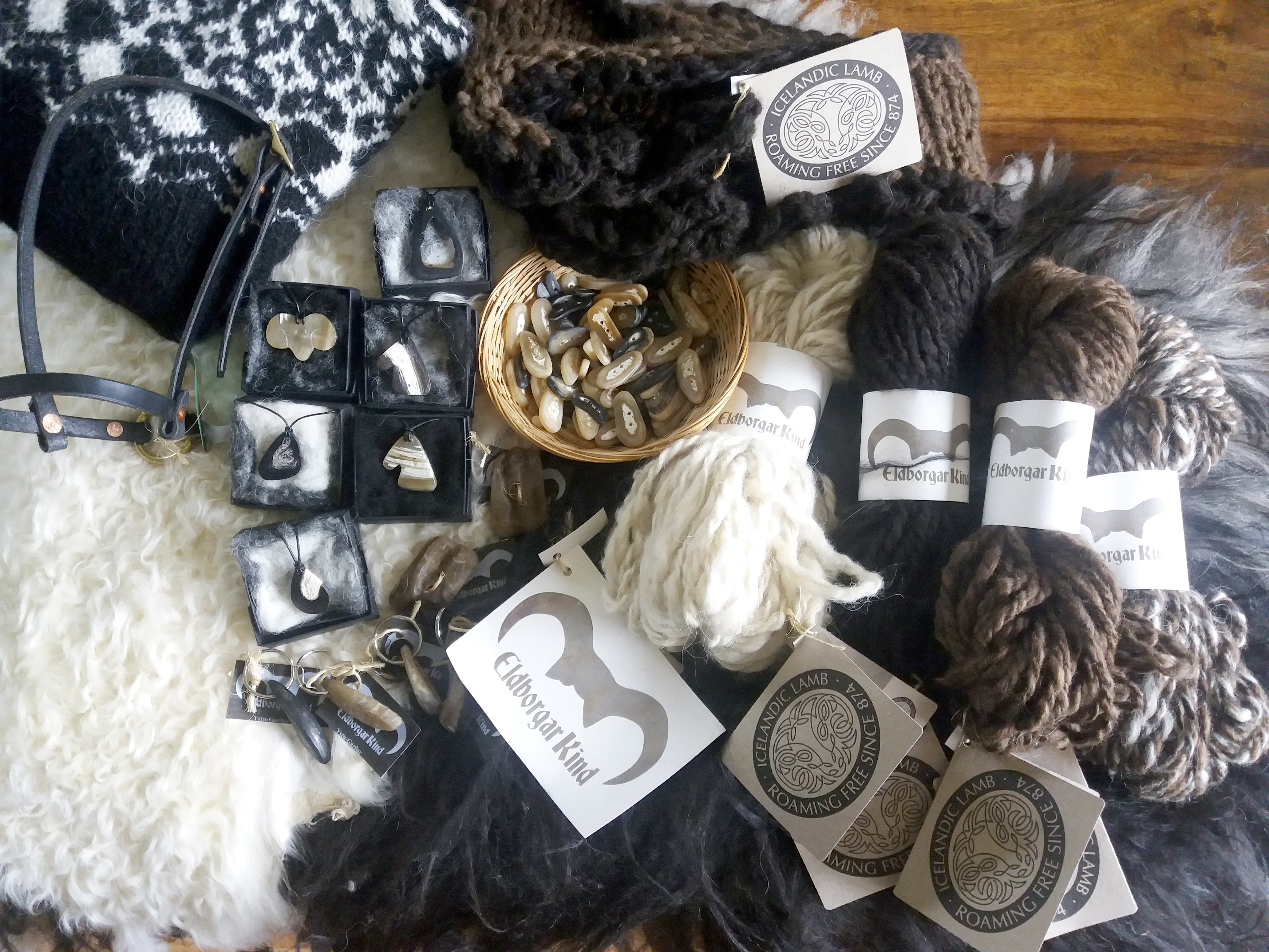 Þóra hefur unnið með horn og ull í sínu handverki og selur varninginn undir nafninu Eldborgar kind.