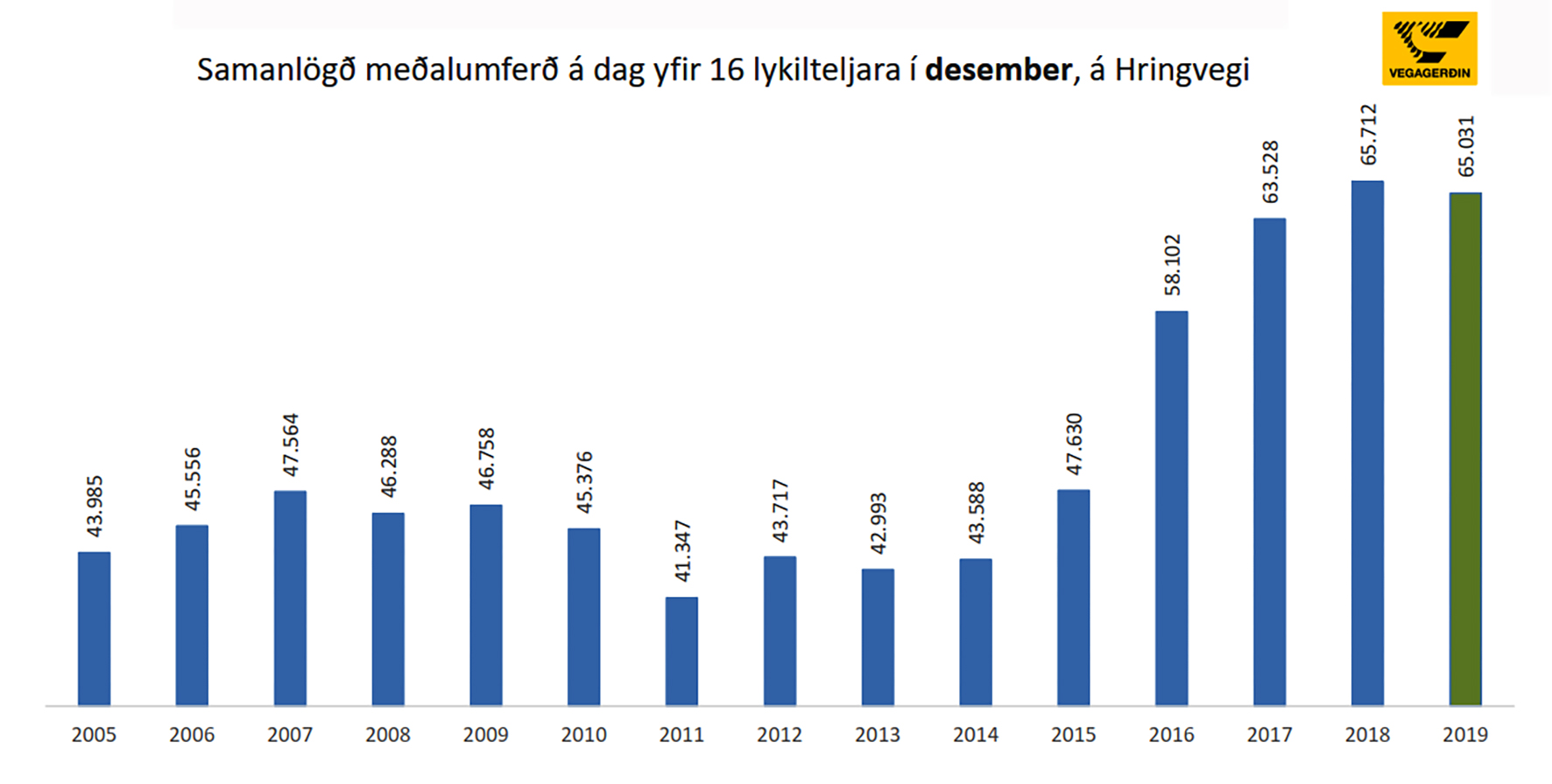 Samdráttur varð á umferð um Hringveg í síðasta desembermánuði, umferð dróst saman um 1% miðað við umferð í sama mánuði árið á undan. Í heild jókst umferðin á Hringvegi árið 2019 um 2,4 prósent sem er mun minni aukning en undanfarin ár þegar umferðin hefur aukist árlega um 5 og upp í 14%.