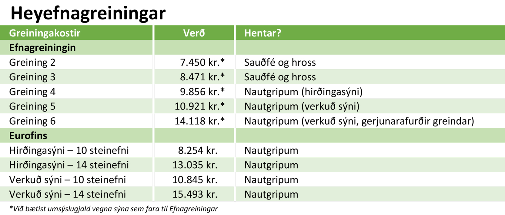 Gott er að skrifa á fylgiseðla með heyjum sem ætluð eru til útflutnings að um útflutning sé að ræða til að tryggja rétta greiningu sýnanna. Útdráttur af verðlistum beggja fyrirtækja sjást í töflunni sem hér fylgir en ítarlegri verðlista má nálgast á heimasíðu RML sem og heimasíðu Efnagreiningar.