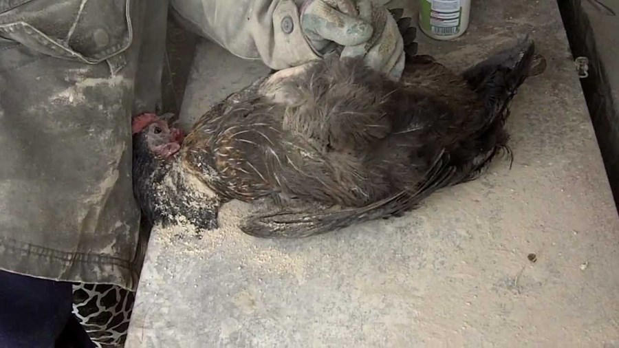 Hæna aflúsuð og mítlahreinsuð á eggjabúi í Hollandi.