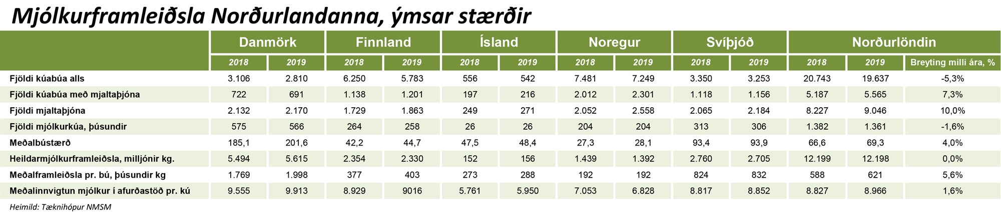 Segja má að þrátt fyrir að heildarframleiðslan standi í stað á milli ára þá hafi orðið mikil hagræðing í búgreininni á milli áranna 2018 og 2019 en í fyrsta skipti í sögunni er heildarfjöldi kúabúa á Norðurlöndunum kominn niður fyrir 20 þúsund og voru þau í árslok 2019 19.637 talsins.