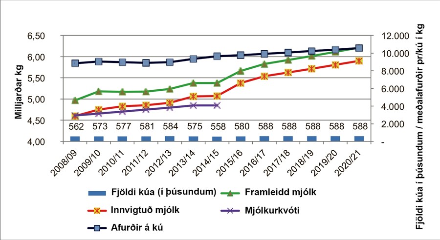 Vegna erfðaframfara muni afurðir eftir hverja kú halda áfram að aukast. Allt bendir því til að framleiðslan muni aukast talsvert á næstu árum. Myndin gefur hugmynd um hvað séu líklegar breytingar í mjólkurframleiðslunni til ársins 2021 að mati höfundar. Gert er ráð fyrir árlegri afurðaaukningu sem nemur 1,5% á grip á ári en það er minna en ráðgjafaþjónustan spáir, þeirra spár gera ráð fyrir 11.000 kg ársnyt árið 2018. Gerist það næst sex milljarða markið í innveginni mjólk því annaðhvort fyrr eða með færri kúm en ella. − Já, þannig líta Danir á málin.