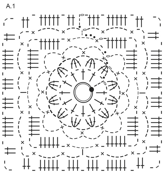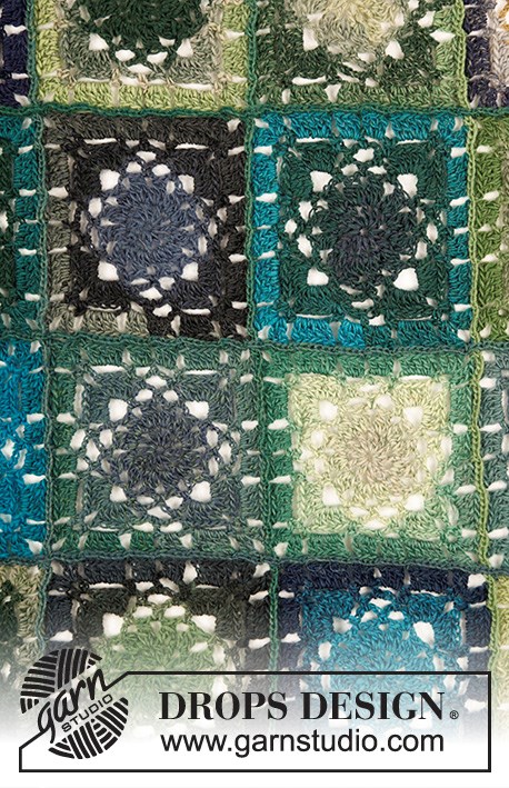 150 g litur 16, grænn/blár, 100 g litur 07, ljósbrúnn/blár, 100 g litur 09, túrkís/fjólublár. Ef teppið er heklað í einum lit þarf ca 500 g af þeim lit.