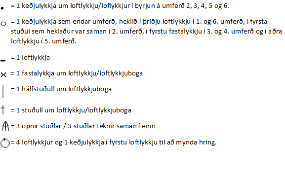 Heklfesta: 20 stuðlar x 11,5 umferðir = 10 x 10 cm. Hver dúlla mælist ca 12 x 12 cm.