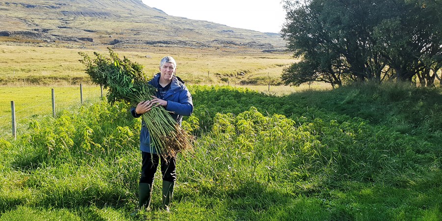Pálmi Einarsson, iðnhönnuður og bóndi í Gautavík, skoðar vöxt iðnaðarhampsins í Berufirði.