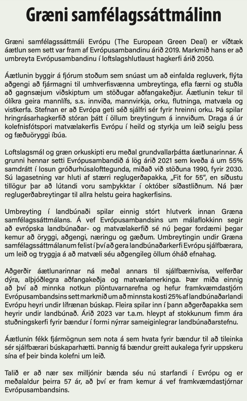 Ég tel að ef við vöndum okkur í innleiðingu á regluverkinu og forsendumælingum á losun frá landbúnaði þá sé það eitthvað sem við ráðum við. En það er háð því að við fáum rauntölur um losun frá íslenskum landbúnaði.