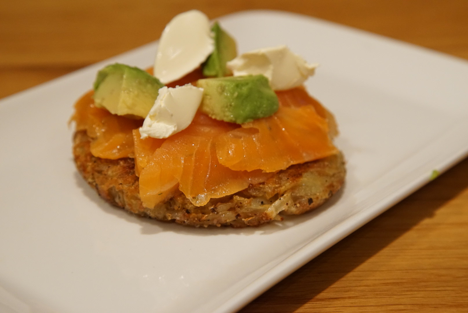 Setjið kartöflur í sigti og kreistið út alla safa. Sett í skál, bætið í eggi, hveiti og bræddu smjöri. Kryddið með salti og pipar. Hitið olíu á pönnu yfir miðlungsháum hita. Setjið svo kartöflublöndu og fletjið örlítið með spaða, hér kemur teflon-panna sterk inn svo festist ekki við pönnuna. Eldið í 1–2 mínútur á hvorri hlið eða þar til gullinn brúnn litur er kominn á kökuna. Endurtakið með restina af kartöflublöndunni og látið kólna örlítið. Toppið hverja kartöflu röstí með doppu af sýrðum rjóma, sneiddum reyktum laxi. Ferskt dill og lárpera til skrauts. Kryddið með svörtum pipar.