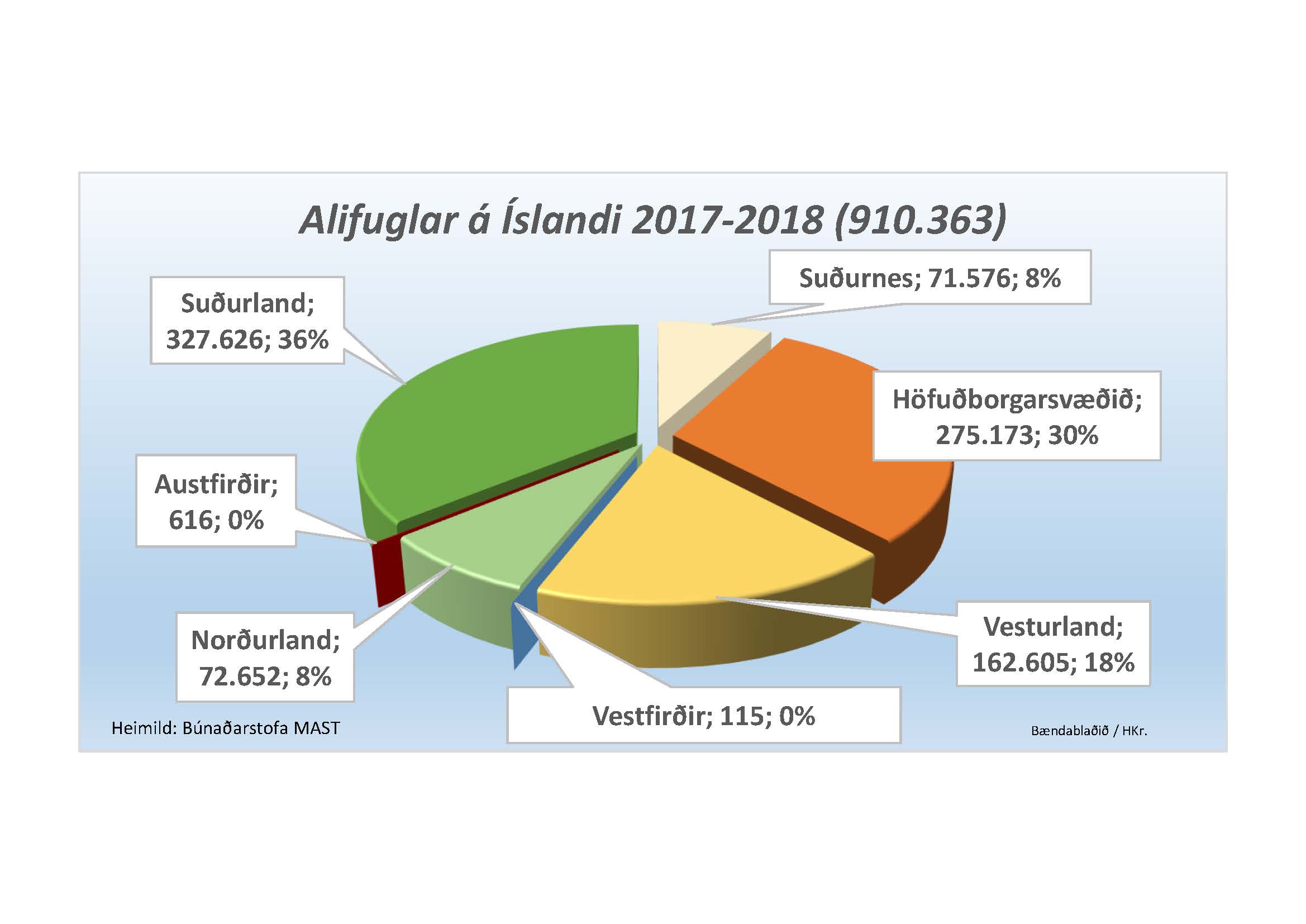 Verulega hefur verið bætt úr talnagögnum varðandi alifuglana. Í fyrra skorti mikið á að tölur stæðust um heildarfjölda fugla, en þar voru alifuglarnir taldir vera 358.979 á 469 búum. Þá vantaði inn tölur um kjúklinga sem nú eru taldir 598.847. Reyndar verða tölur um alifugla trúlega alltaf tilefni til skoðanaskipta, því tölurnar geta verið mjög breytilegar frá mánuði til mánaðar.