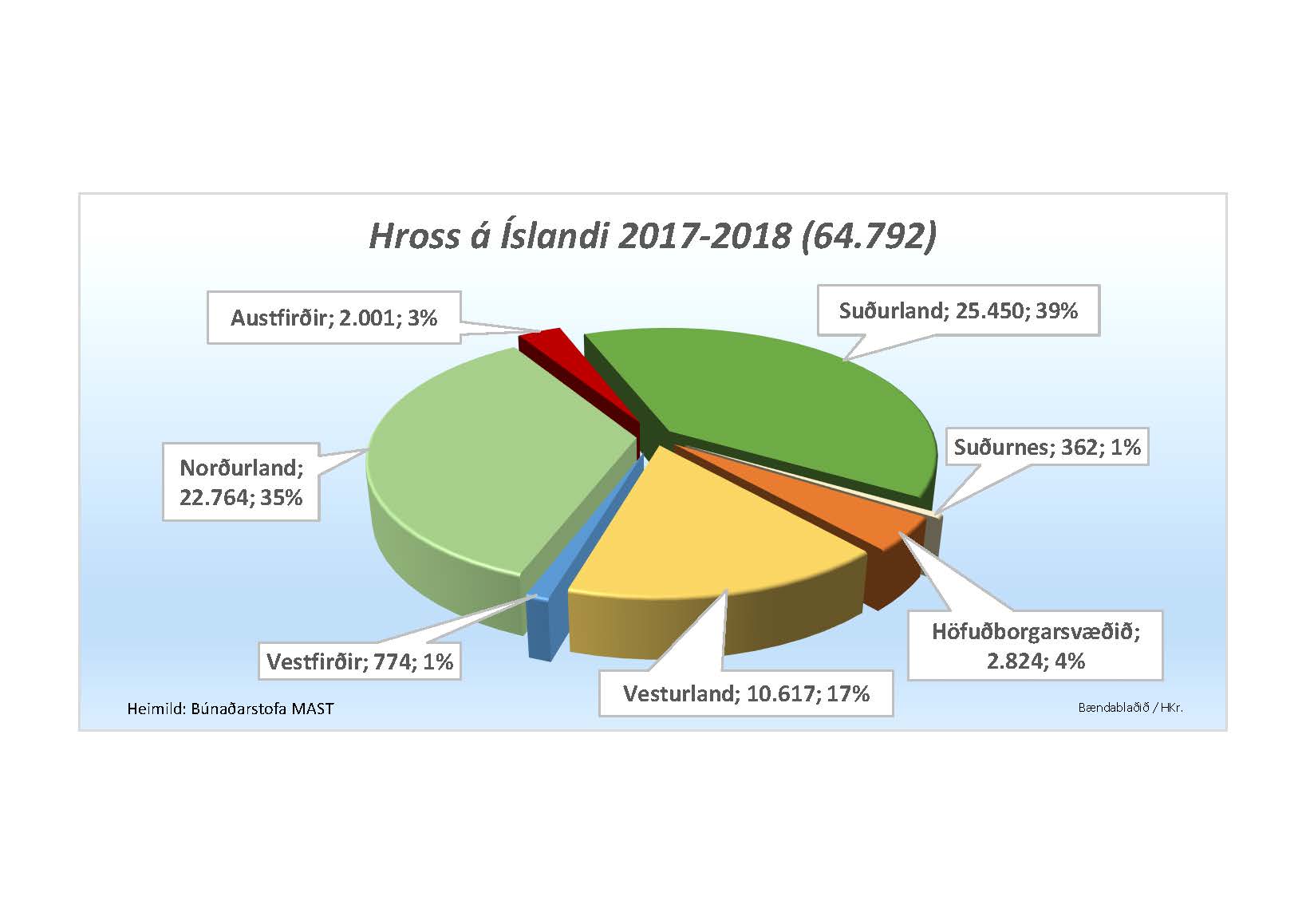 Þá eru hross í landinu nú talin vera 64.792 á 2.262 búum. Hrossin voru hins vegar talin vera 67.186 í tölum Búnaðarstofu MAST vorið 2017 og hefur því fækkað um 2.394 hross. Þá hefur hrossabúunum eða ræktendum einnig fækkað, eða um 208.