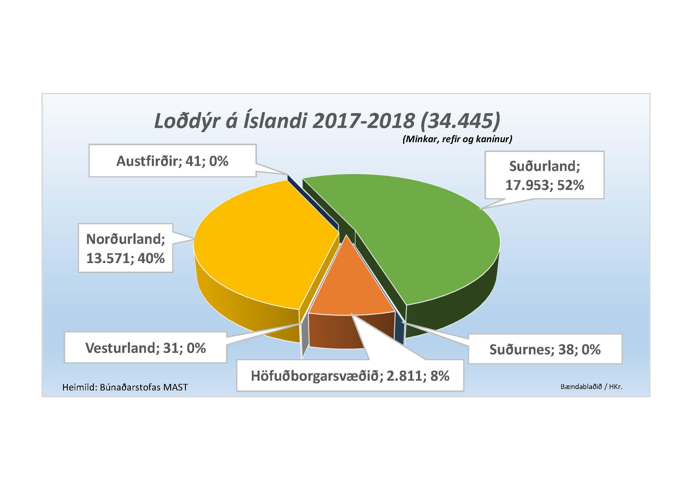 Loðdýr eru 34.445 talsins samkvæmt nýjustu tölum MAST og hefur því fækkað á milli ára. Voru þau 38.773 í tölum MAST 2017 og hefur því fækkað um 4.328 dýr, þ.e. fullorðnir högnar og læður. Inni í þessum tölum eru líka 2 refir og 323 kanínur. Í heild eru búin 63, en þar af 38 með mink og ref, en þau voru talin 39 í fyrra. Augljóst virðist að lokauppgjör ársins sé ekki í þessum tölum frekar en í fyrra. Vitað er um eina fimm minkabændur sem hættu starfsemi undir lok síðasta árs svo taka verður þessum tölum með fyrirvara.