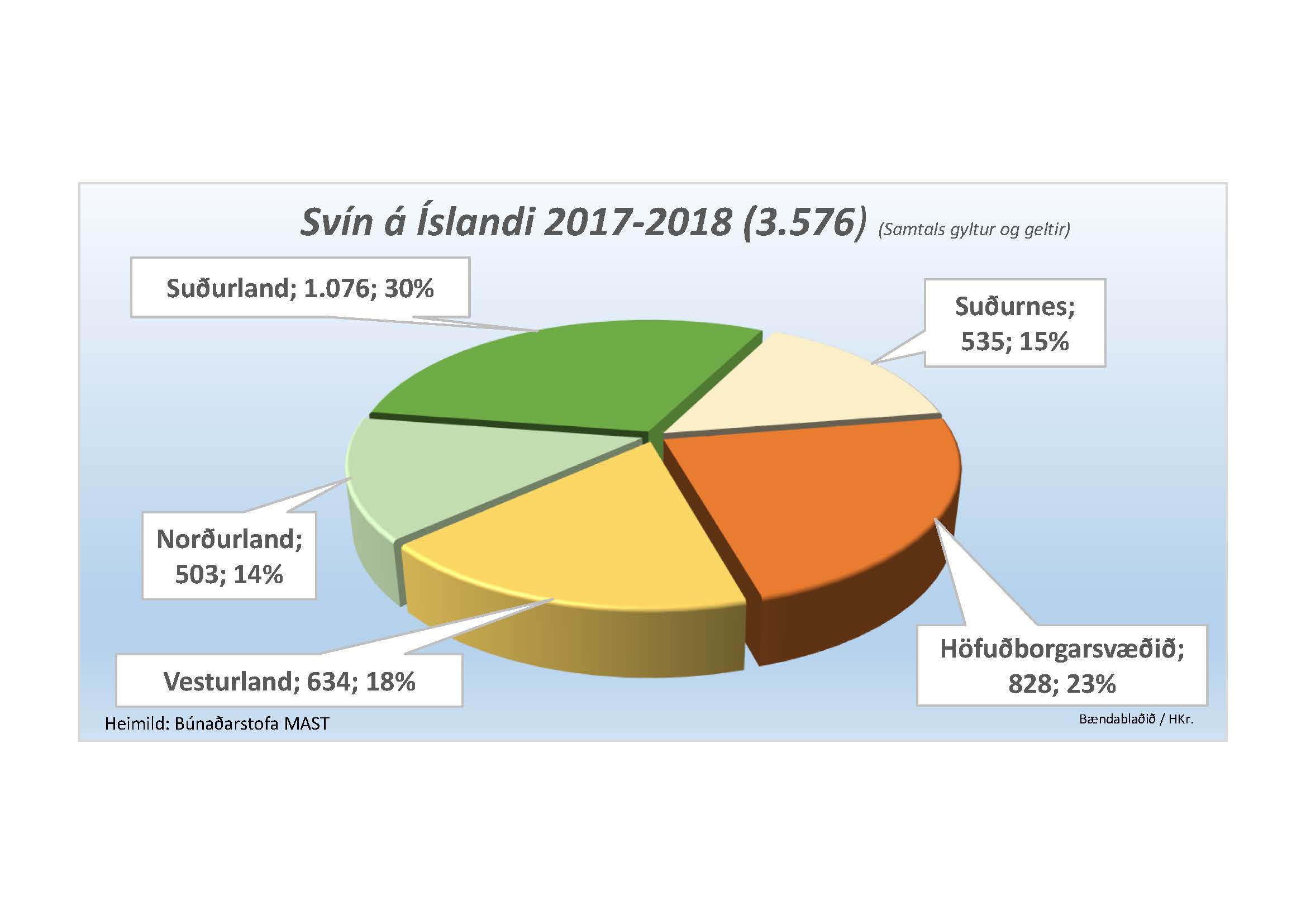Svín eru 66 fleiri en í síðustu tölum, eða 3.576 á móti 3.510 í fyrra. Þá eru svínabú nú sögð vera 20 en voru 19 í fyrravor. Þarna er aðeins verið að tala um fullorðnar gyltur og gelti, en ekki grísi. Ef grísirnir eru taldir með er heildarfjöldi svína mun meiri, því þar eru 20.421 eldisgrís, 7.000 smágrísir og 9.528 fráfærugrísir. Fjöldi grísa er mjög rokkandi á milli mánaða svo til að gera tölur samanburðarhæfar milli ára er eðlilegast að miða eingöngu við gyltur og gelti.