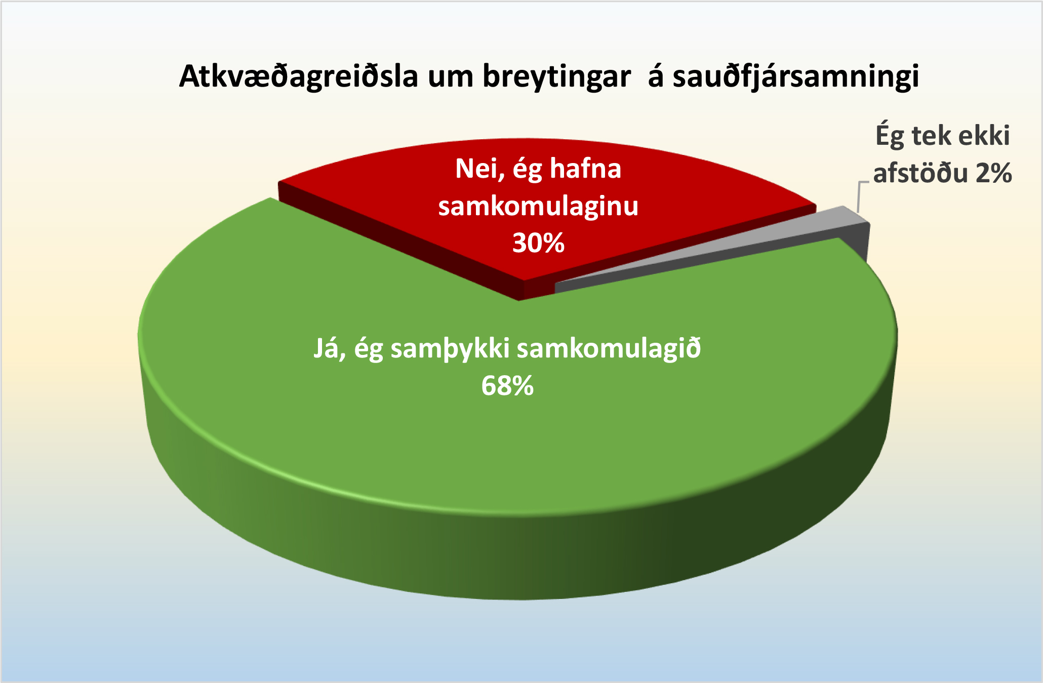 Sauðfjárbændur samþykktu nýverið breytingarnar á samningnum sínum við ríkið með 68,12% greiddra atkvæða. Alls voru 2.297 á kjörskrá en atkvæði greiddu 1.035, eða 45%, 705 aðilar samþykktu en 313 höfnuðu samkomulaginu. 17 tóku ekki afstöðu.