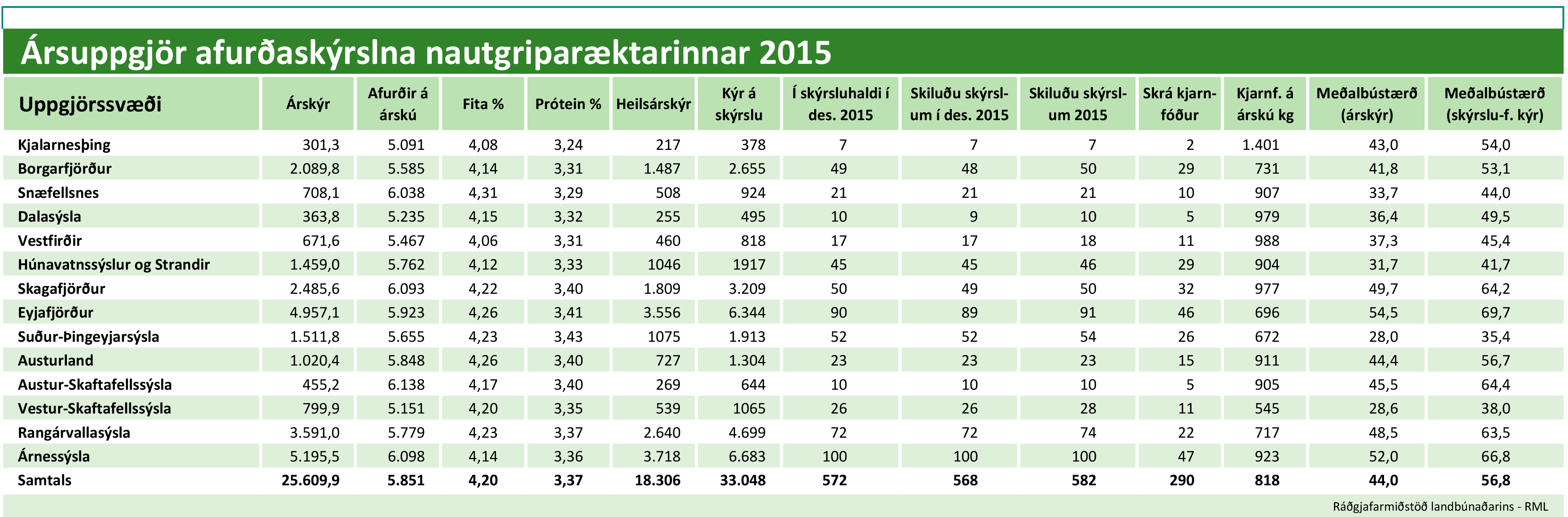 Hér á eftir verður farið yfir helstu tölur úr uppgjörinu. Þeir framleiðendur sem skiluðu upplýsingum um afurðir kúa sinna á nýliðnu ári voru 580 en á árinu 2014 voru þeir 579. Niðurstöðurnar eru þær helstar að 25.609,9 árskýr skiluðu 5.851 kg nyt að meðaltali. Það er hækkun um 130 kg frá árinu 2014 en þá skiluðu 23.861 árskýr meðalnyt upp á 5.721 kg. Mestar meðalafurðir 2015 voru í Austur-Skaftafellssýslu 6.138 kg eftir árskú. Árið 2014 voru meðalafurðirnar einnig mestar þar, 6.302 kg eftir árskú. Meðalbústærð reiknaðist 44,0 árskýr á árinu 2015 en sambærileg tala var 41,2 árið á undan. Meðalbústærð reiknuð í skýrslufærðum kúm var nú 56,8 kýr en 2014 reiknuðust þær 54,2.