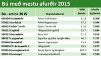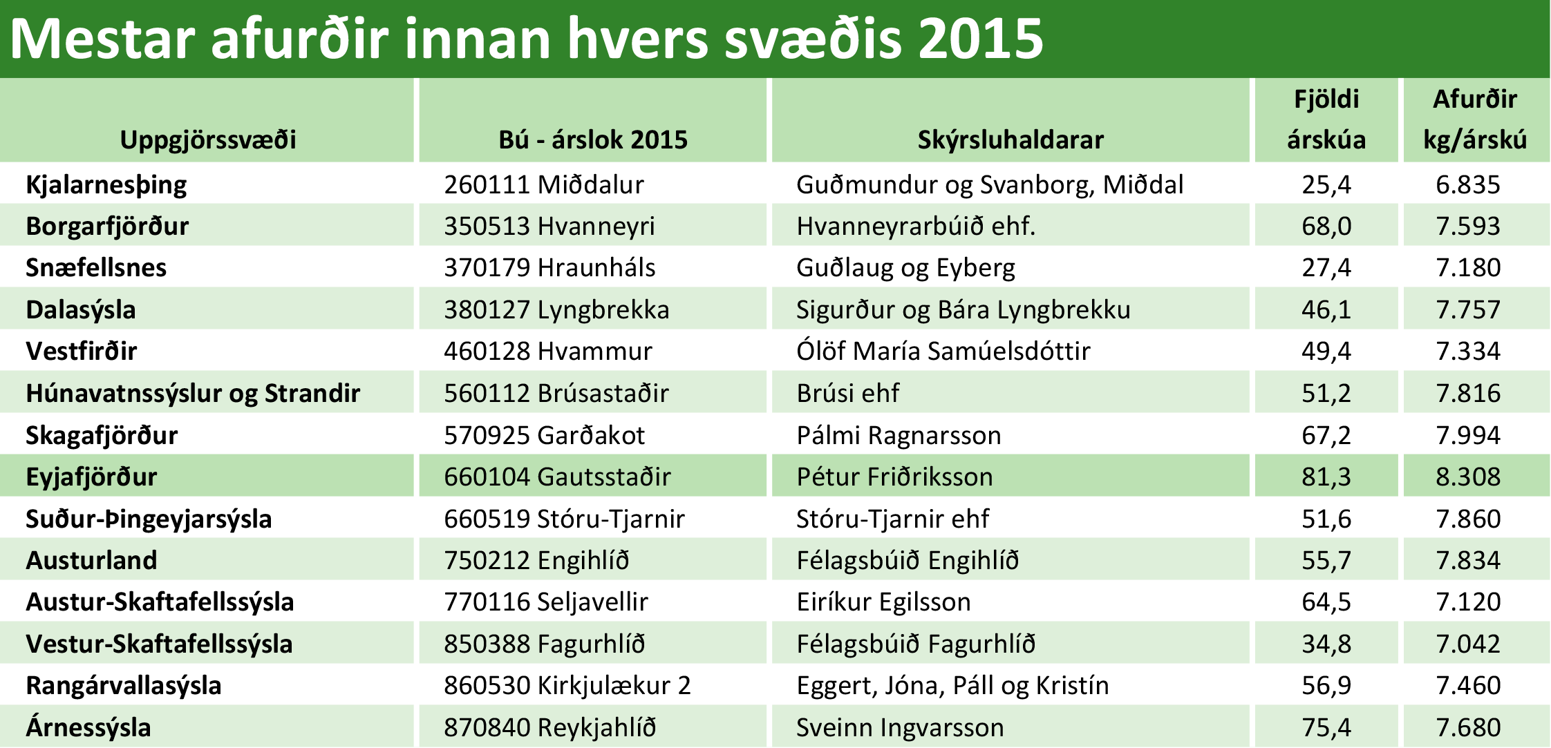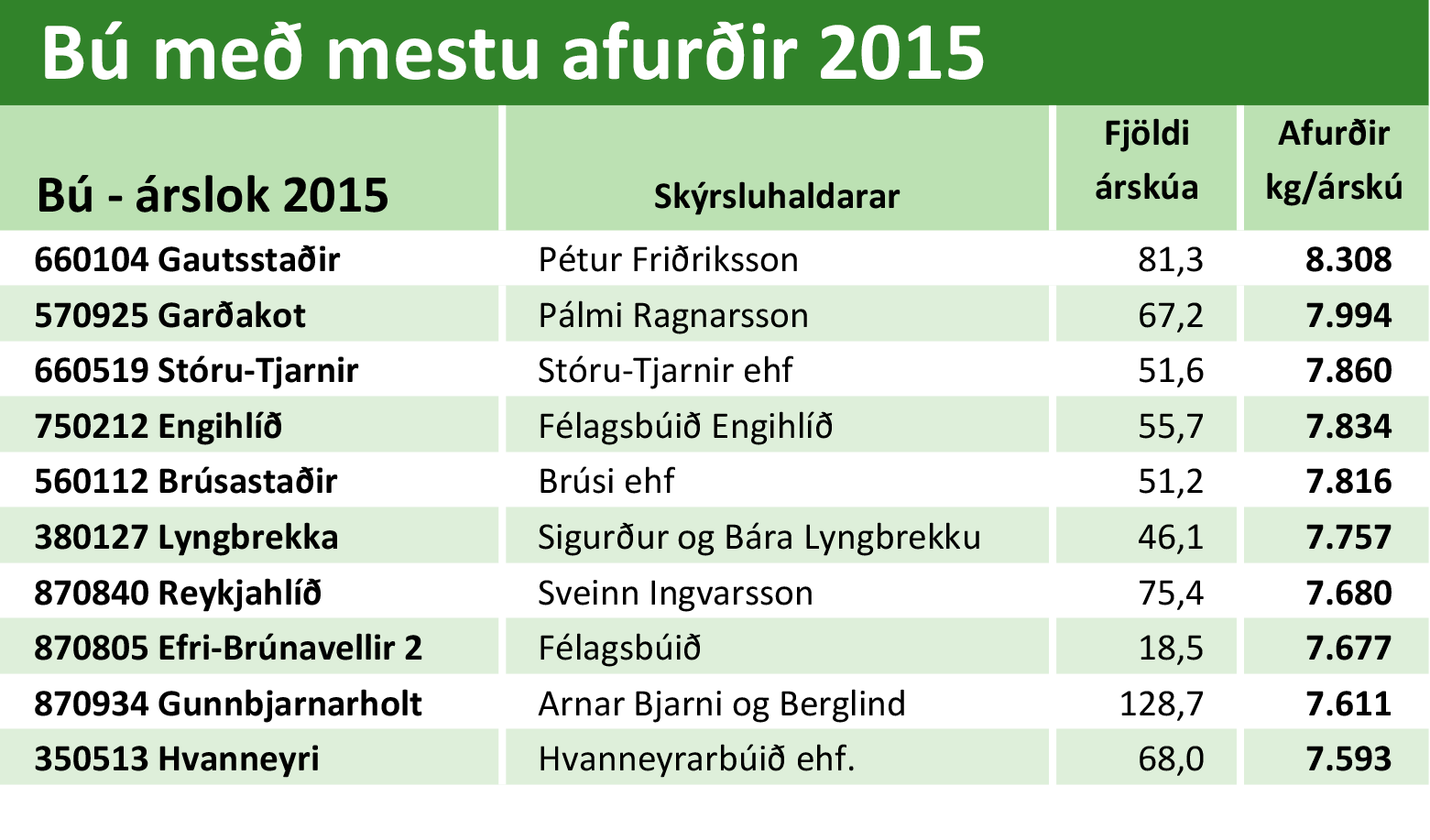 Mest meðalnyt eftir árskú á nýliðnu ári, 2015, var á búi Péturs Friðrikssonar á Gautsstöðum á Svalbarðsströnd, 8.308 kg á árskú. Þetta bú var fjórða afurðahæsta búið á árinu 2014. Annað búið í röðinni árið 2015 var bú Pálma Ragnarssonar í Garðakoti í Hjaltadal en þar var nytin 7.994 kg eftir árskú. Þriðja í röðinni við uppgjörið nú var bú Stóru-Tjarna ehf. á Stóru-Tjörnum í Ljósavatnsskarði, S-Þing. en þar var nytin 7.860 kg eftir árskú. Fjórða í röðinni að þessu sinni var Félagsbúið í Engihlíð í Vopnafirði þar sem árskýrin skilaði 7.834 kg að jafnaði. Fimmta búið var bú Brúsa ehf. á Brúsastöðum í Vatnsdal þar sem meðalafurðirnar voru 7.816 eftir hverja árskú. Næsta bú, nr. 6 á listanum var bú Sigurðar og Báru í Lyngbrekku á Fellsströnd, en þar var meðalnytin 7.757 kg. Sjöunda var bú Sveins Ingvarssonar í Reykjahlíð á Skeiðum en þar skilaði meðalárskýrin 7.680 kg á síðasta ári. Áttunda í röðinni var Félagsbúið á Efri-Brúnavöllum 2 á Skeiðum þar sem árskýrin mjólkaði að meðaltali 7.677 kg. Hið níunda á listanum var bú Arnars Bjarna og Berglindar í Gunnbjarnarholti í Skeiða- og Gnúpverjahreppi en þar voru meðalafurðirnar 7.611 kg eftir árskú. Tíunda búið í röðinni að þessu sinni var bú Hvanneyrarbúsins ehf. á Hvanneyri í Borgarfirði þar sem hver árskýr skilaði 7.593 kg á nýliðnu ári.